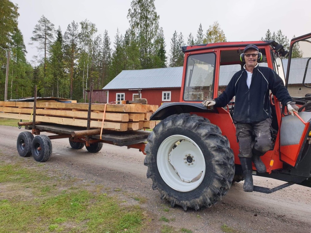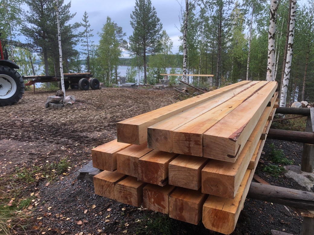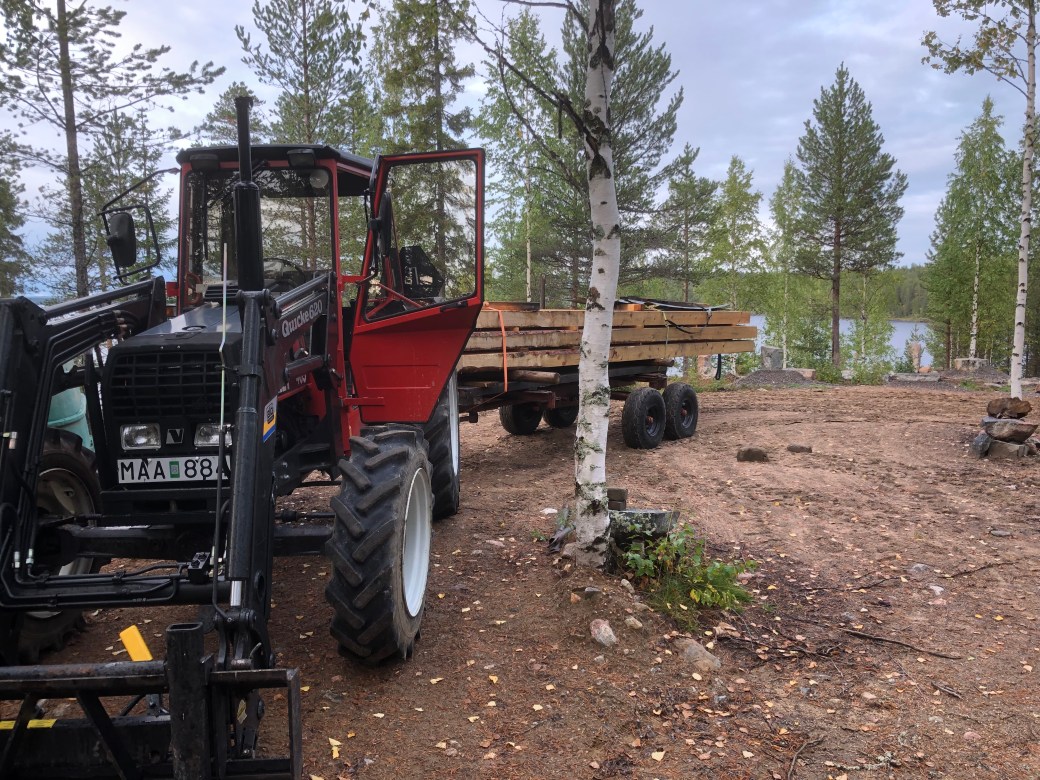 Hemma på gården efter att ha hämtat syllstockarna på BondersbysågenDet gick bra att köra ut hela lasset på udden även om det var lite trångt…Syllstockarna upplagda på rejält underlagDen första stocken på plats….👍 Jag lyckades bära ner den med traktorn nästan hela vägen. Så det blev inte så tungt att få den på plats…