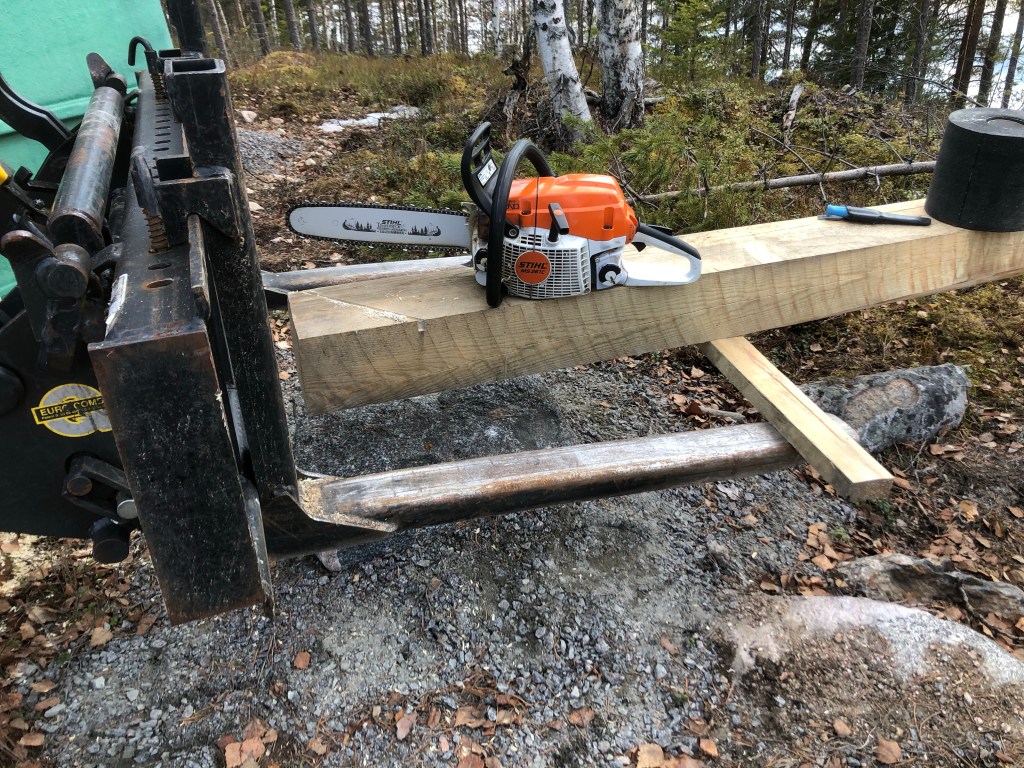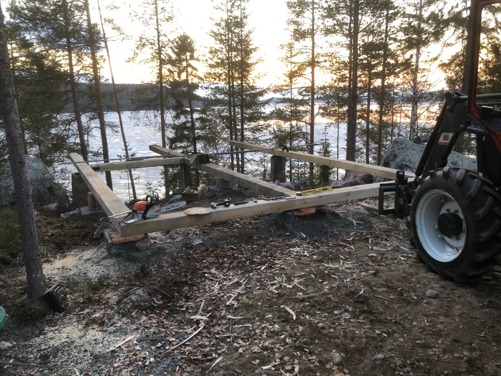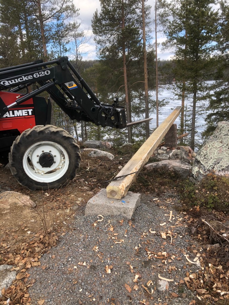 Fantastiskt att ha traktorn som bärhjälp när jag ensam ska baxa tre st 8 m långa syllstockar a’ ca 150-200 kg per styck….Här lyfter jag stocken med hjälp av traktorn för att kunna såga med 45 graders vinkel i hörnet på en av syllstockarna. Det är kul att klura ut hur jag ska göra för att använda hjälpmedlen effektivt, även om det tar lite extra tid…😃Så ser det ut vid denna arbetsdags slut vid kl 23. Påt’ igen i morgon👍😃