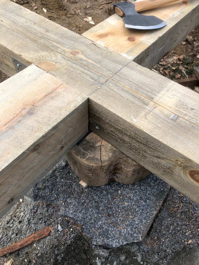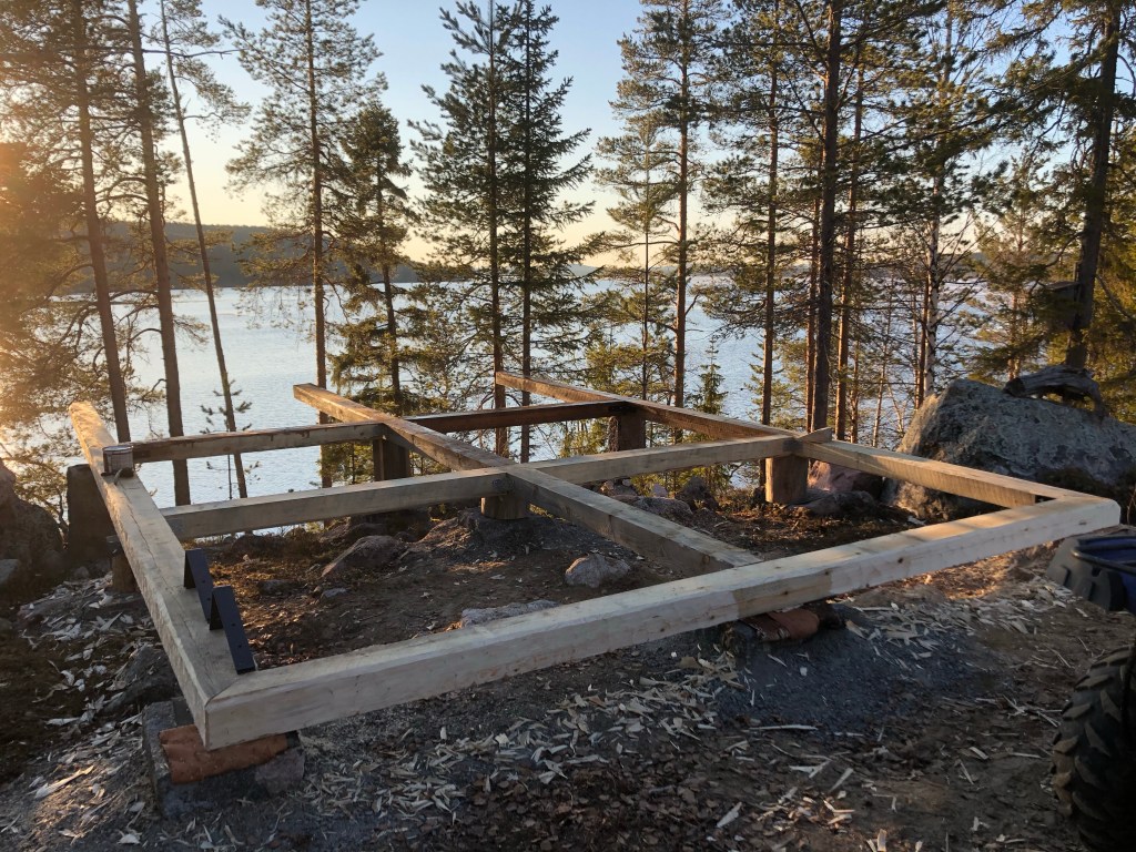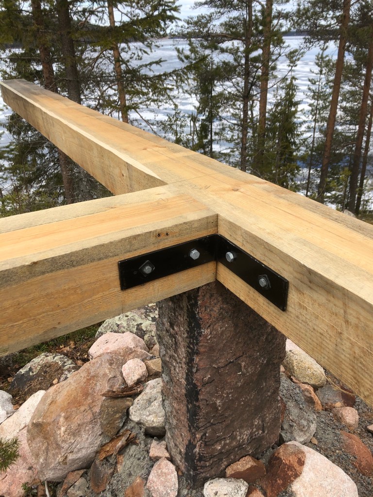 Har t.o.m. oljat den del som ska vara bastu och altan….Bild på vinkeljärn som håller ihop syllstockarna. Ett vinkeljärn som binder ihop syllstockarna med grundstenen ska monteras i samband att ladan monteras upp.Syllstockarna ligger i perfekt våg…👍Rivning påbörjasPlåttaket borta….