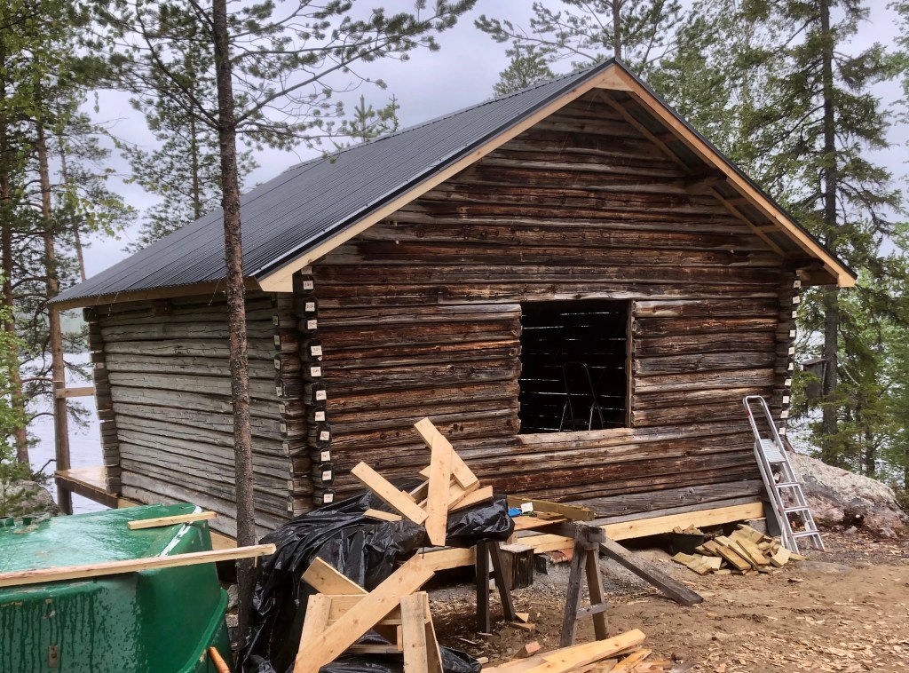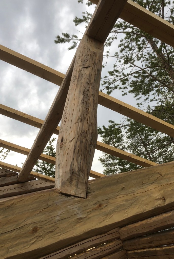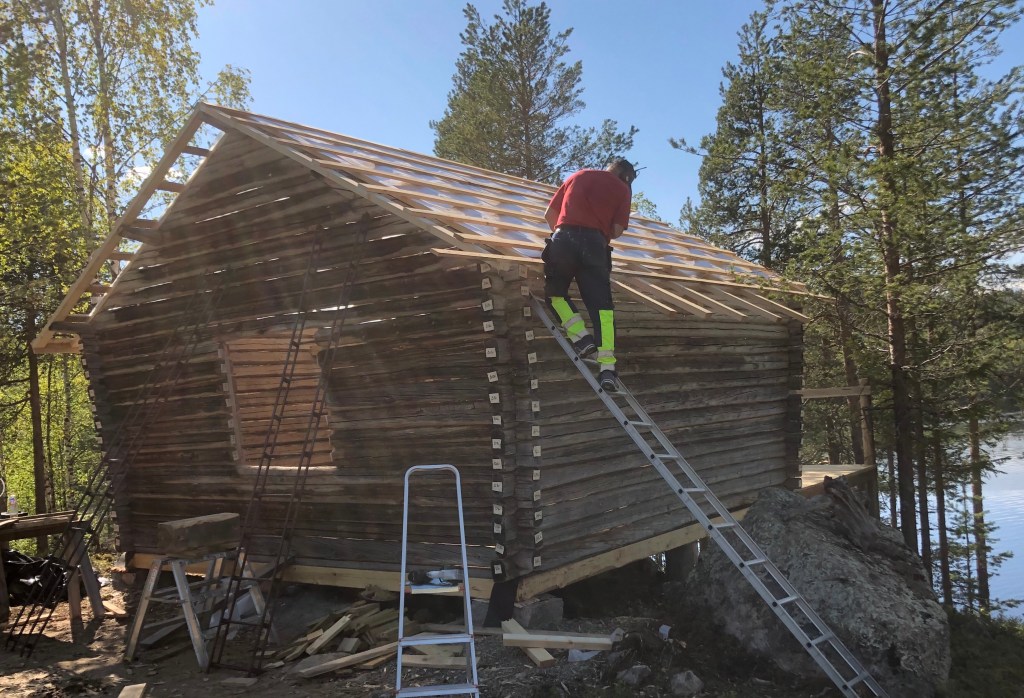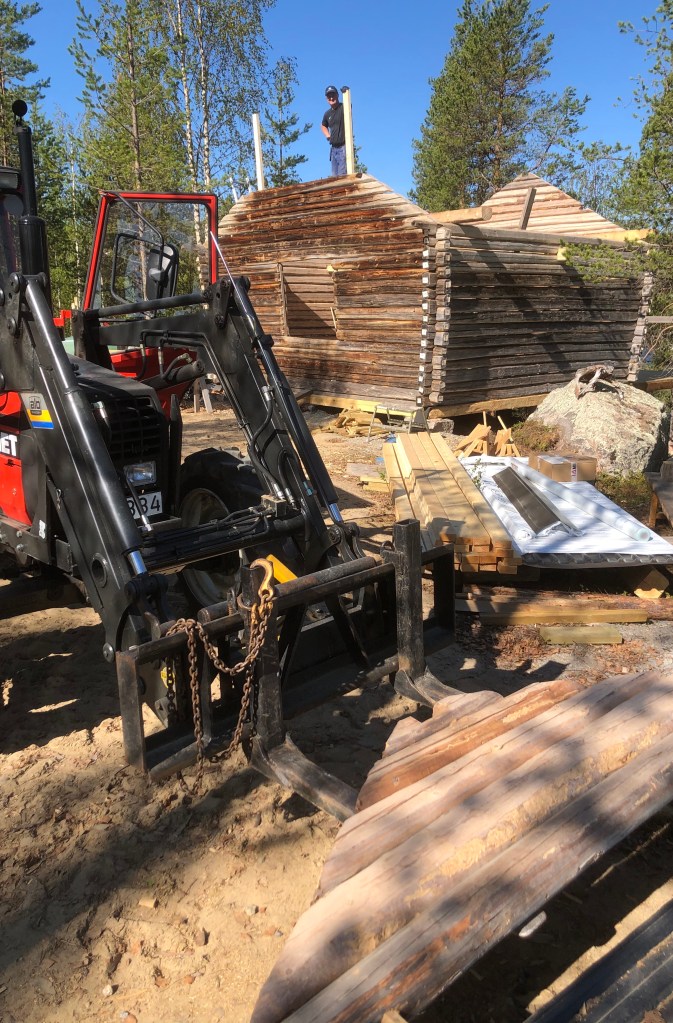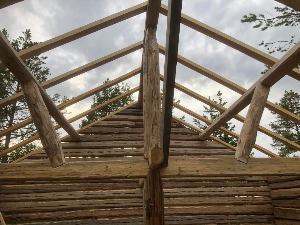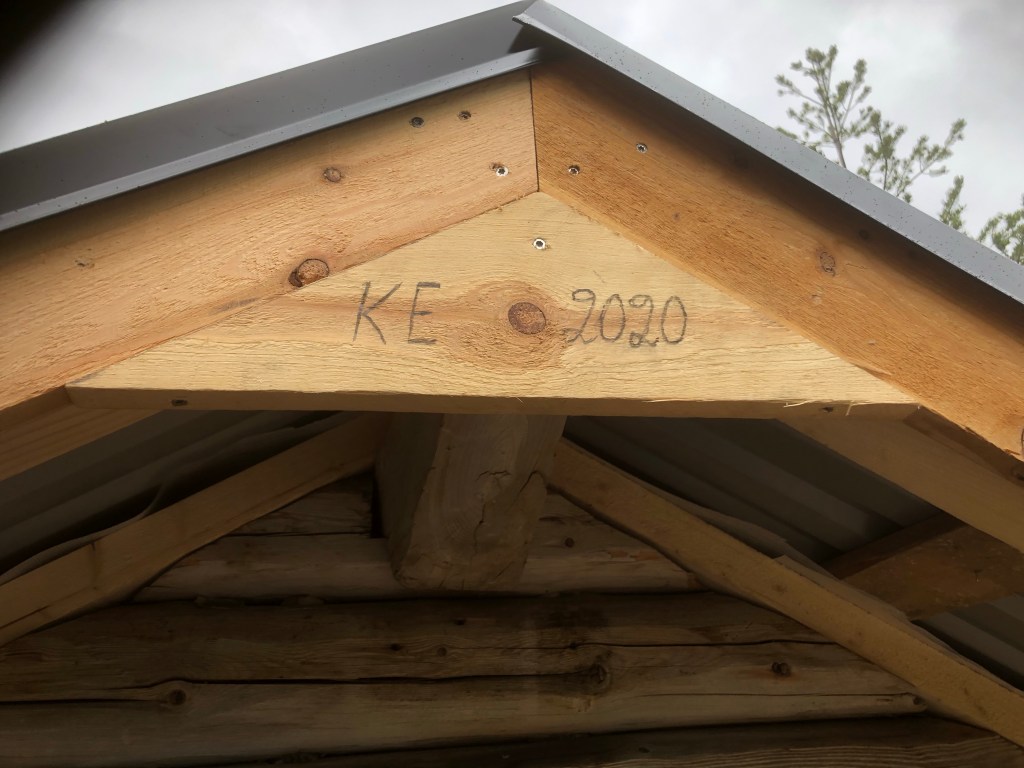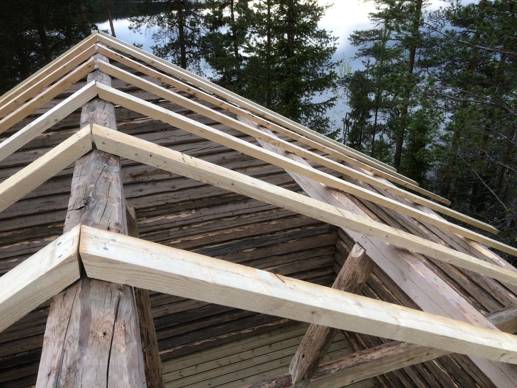 Jag är mycket nöjd med arbetet och resultatet. På 17 dagar har jag; märkt upp samtliga stockändar i timringen, monterat ner tak och timring, byggt grund, byggt golv och altan, transporterat stockar till den nya boplatsen, rest timringen inklusive ”putsning” av samtliga stockar (83 st), byggt två nya åsar samt fyra stöttor till dessa & takåsarna och slutligen byggt ett nytt tak. Det sistnämnda takbygget visade sig vara det mest omfattande jobbet….