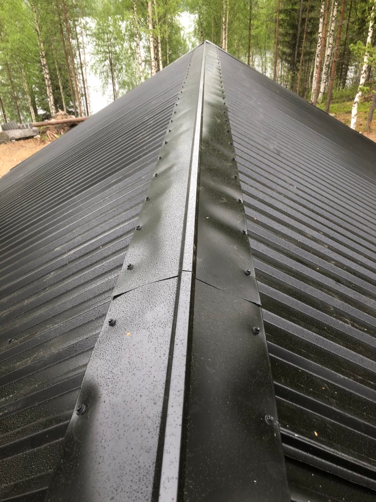 Idag den 5/6 skruvade jag fast den sista farmarskruven i det nya plåttaket så nu är den blivande bastun helt skyddad från nederbörd…👍🙏 Och strax efteråt började det faktiskt regna…😃