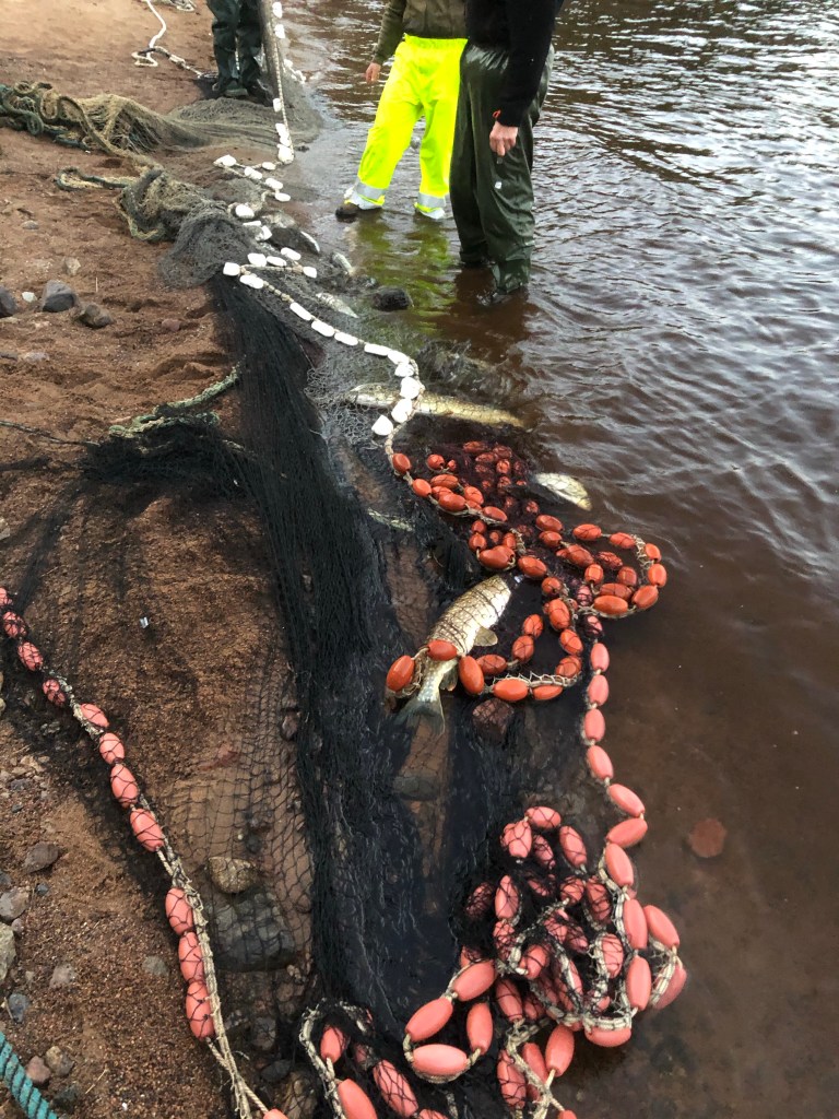 I går kväll den 31/8 var det sista kvällen för notdragning i Kalix älv detta år. Sista kvällen beroende på att det inte är tillåtet att fortsätta dra not i september. I år blev det endast fiske i drygt 2 veckor beroende på extremt högt vattenstånd under juli och början av augusti. Bästa kvällen var den första då man fick 530 sikar i draget! Totalvikt ca 200 kg. Denna sista kväll blev det endast drygt 20 st, troligen beroende på att det fanns några större gäddor i viken som också jagade siken… några av gäddorna följde för övrigt med i noten som kan ses i filmen.
