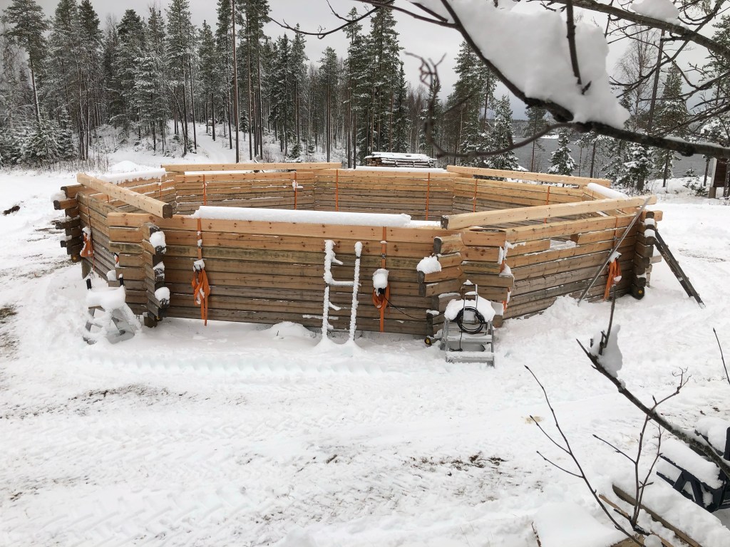 Som synes så har vintern anlänt vilket gör att det blir lite besvärligare att jobba nu. Efter detta varv tar jag semester från timrandet och fortsätter när våren närmar sig….