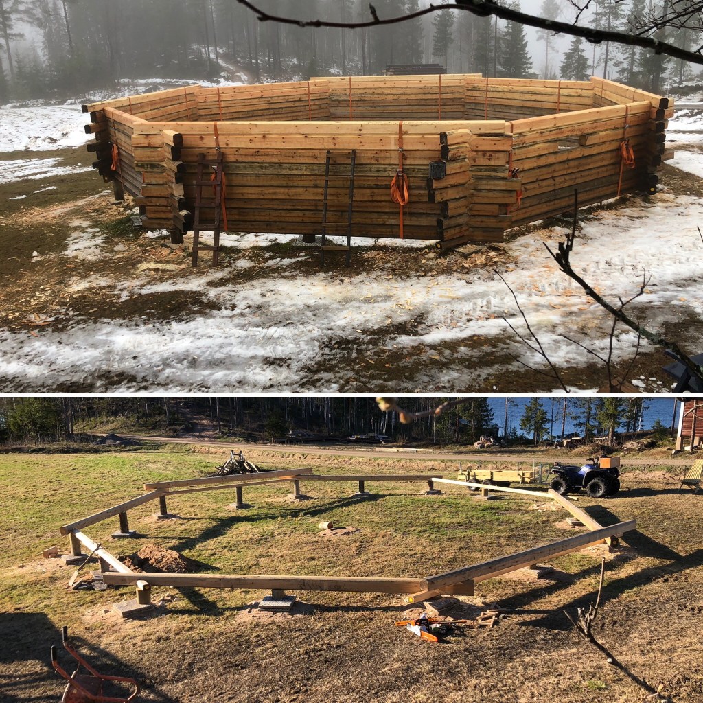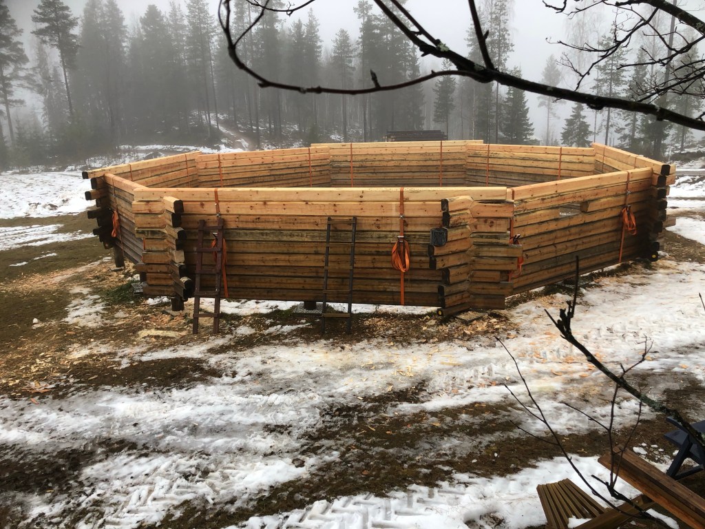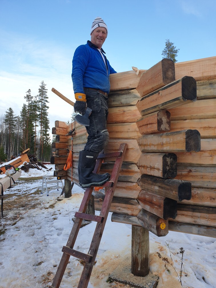 Nu Àr det nionde varvet pÄ plats och jag tar paus i timrandet tills vÄren anlÀnder (april). Höjden Àr nu ca 190 cm och jag har nÄtt drygt halvvÀgs till mÄlet, som Àr ca 340-350 cm (= ca 16 varv).