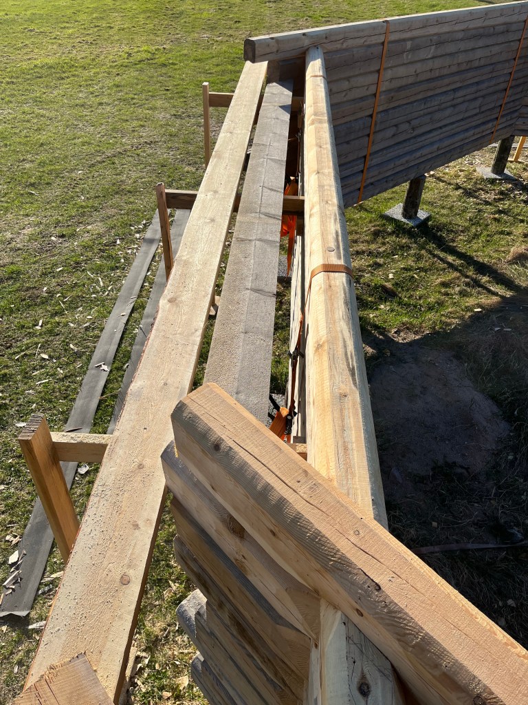 Räcke saknas än så länge. Anledningen är att det det blir i vägen när jag ska lyfta upp väggstockarna. Jag får istället skruva fast ett räcke som jag flyttar med mig vartefter jag timrar respektive väggstock.