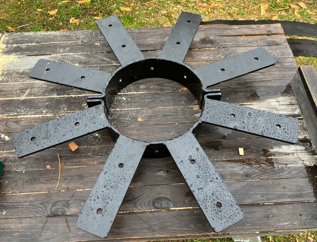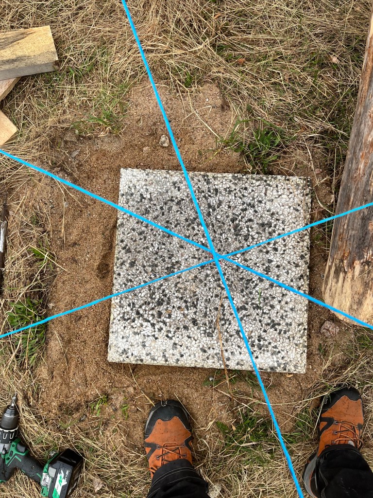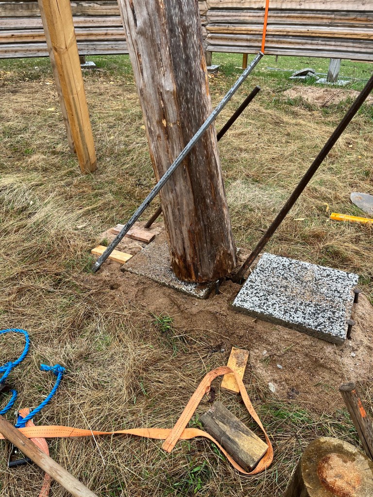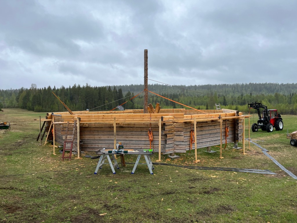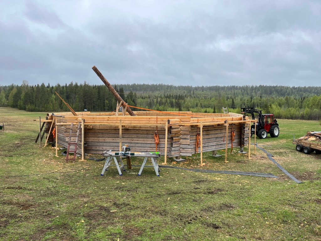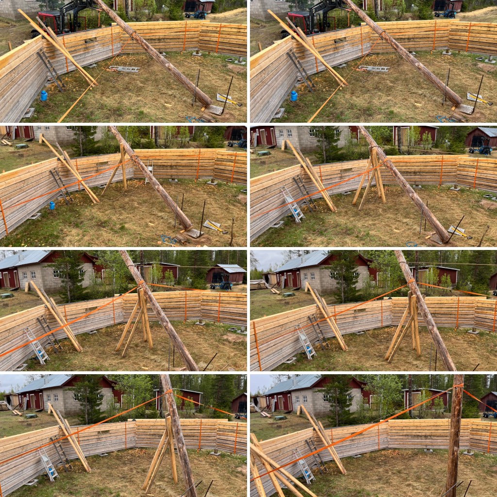 Nu är den uppe, den 6,5 meter höga ”pfallossymbolen”…😁. Det tog 6 timmar av planering och försiktigt försiktigt arbete med traktorn, spännband, spett m.fl. hjälpmedel. Det som nu återstår är att stötta upp den så den står i perfekt lod. Därefter timra två varv till och därefter ska 8 åsar fällas in i väggarna och fästas i centrumstolpen.