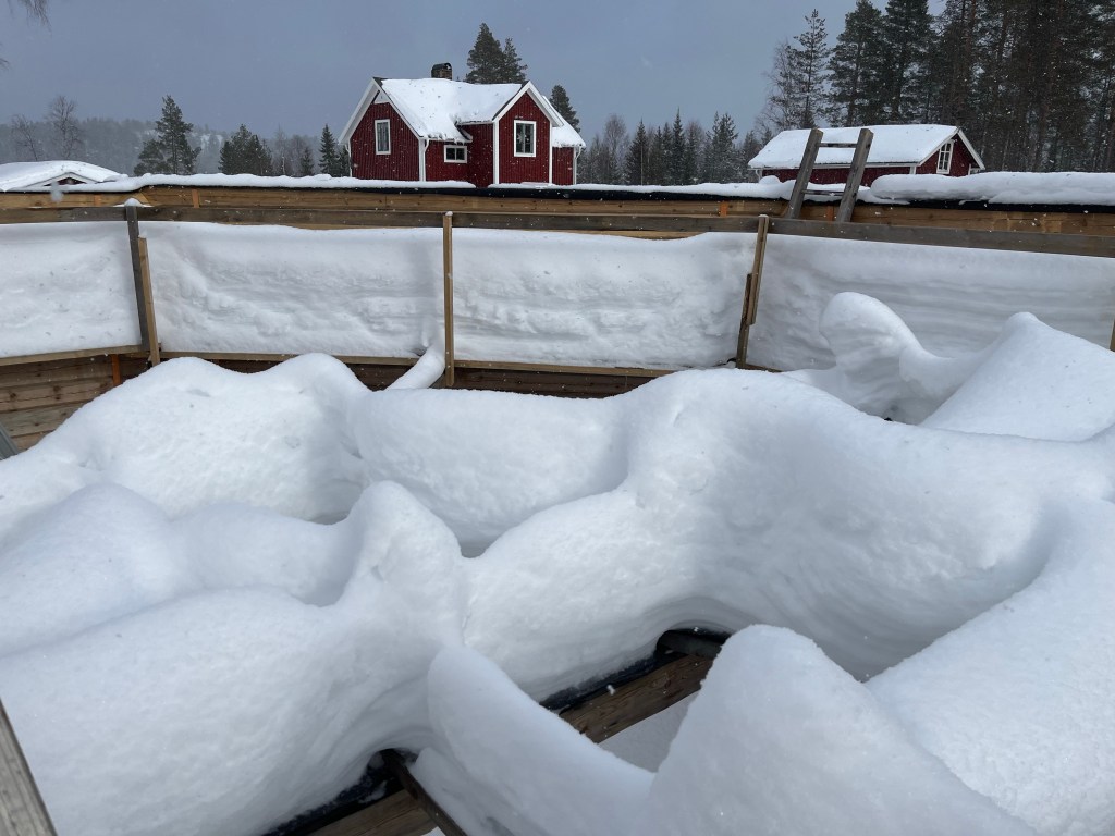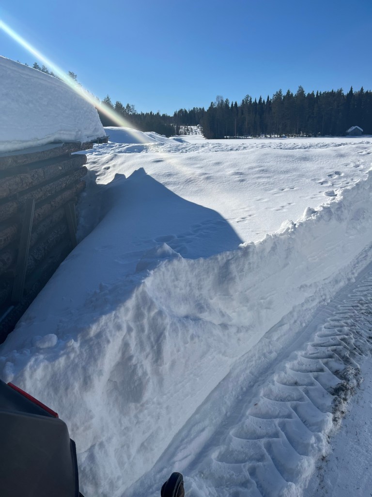 Det ligger mycket snö på åsarna. Jag kommer att skotta bort den för att undvika onödig fukt i timringen när snösmältningen sätter igång.