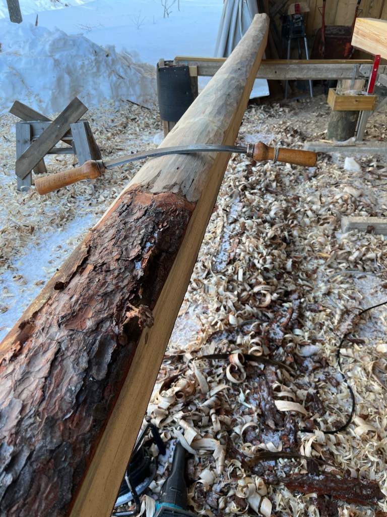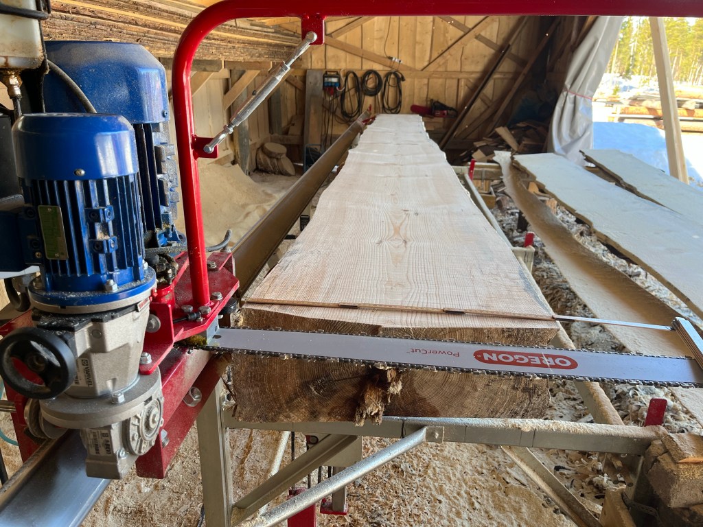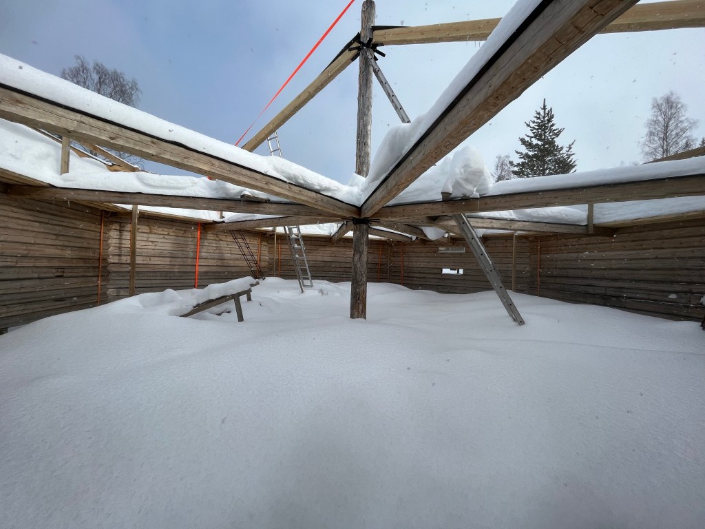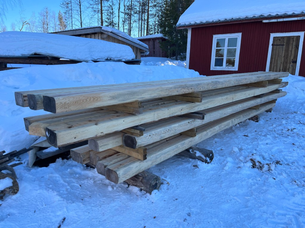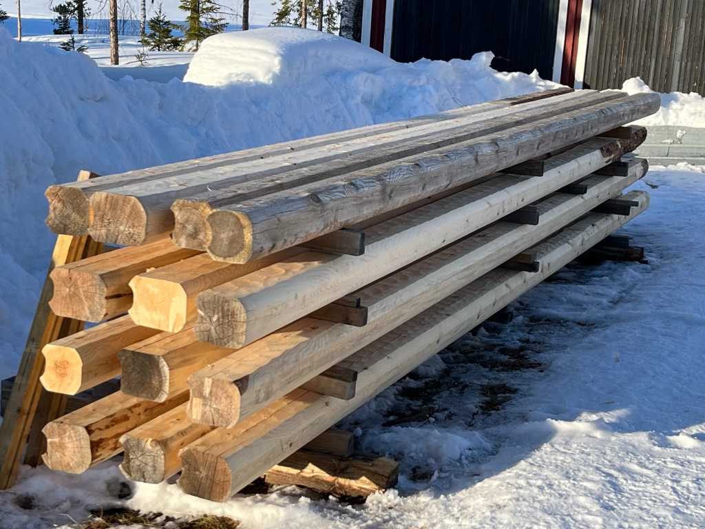Nu (i slutet av april) har jag preparerat samtliga takstolar (14 st) samt kvarvarande vÀggstockar och Äsar. Totalt 32 stockar.