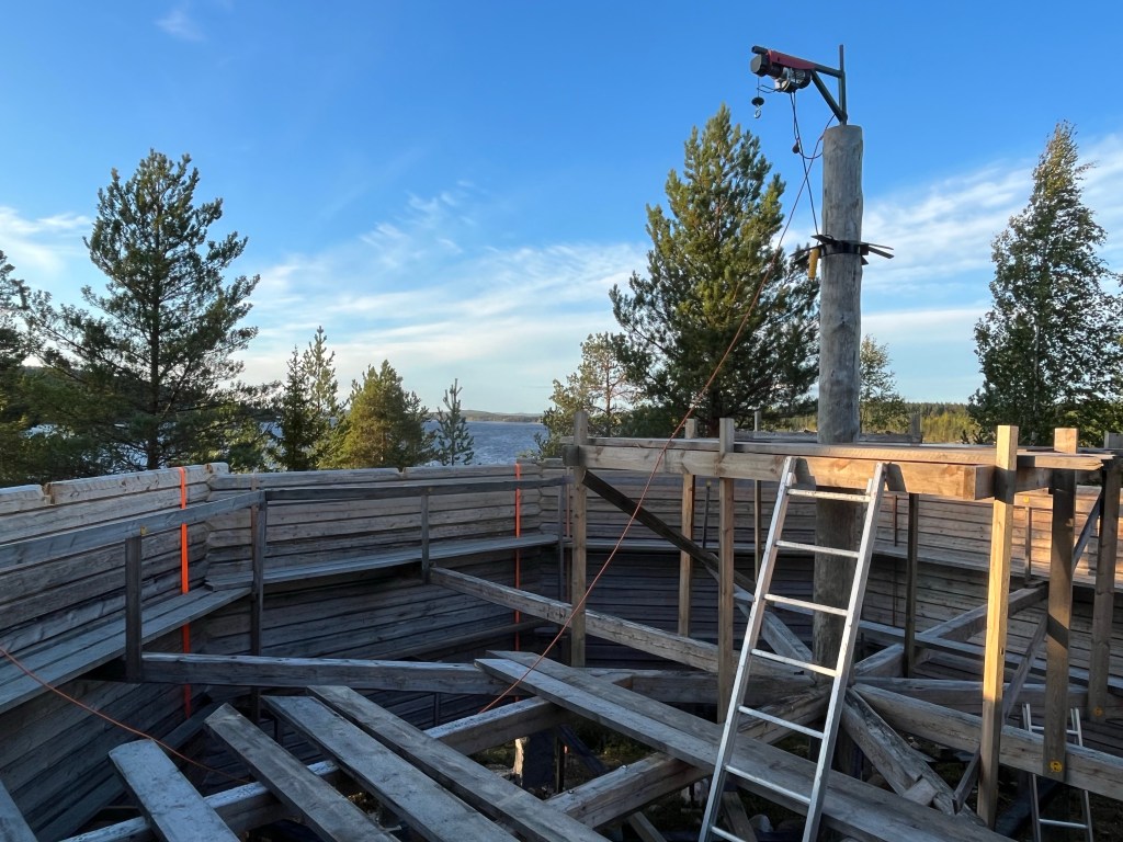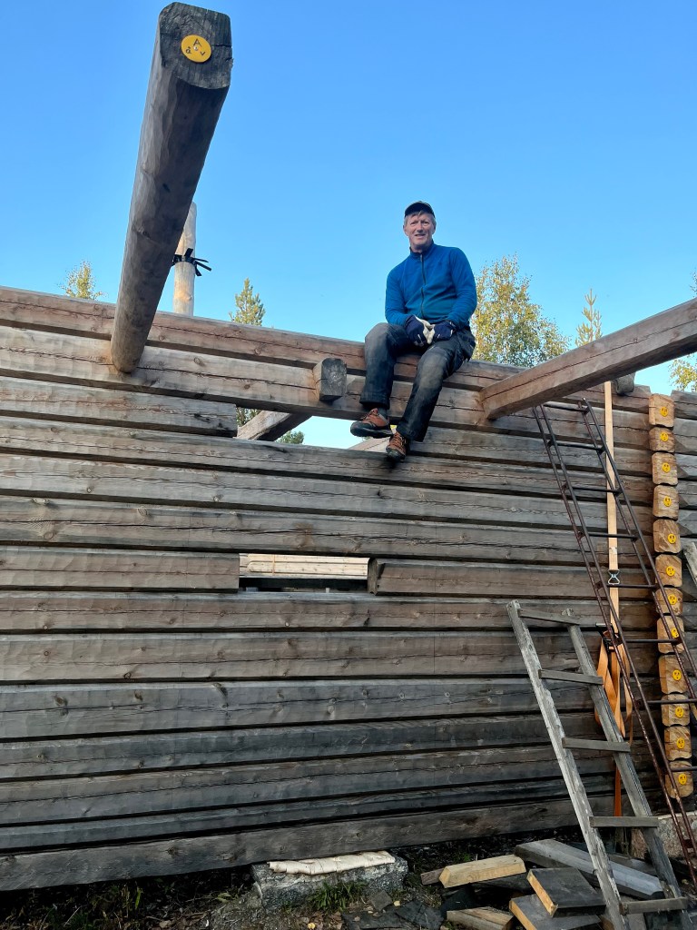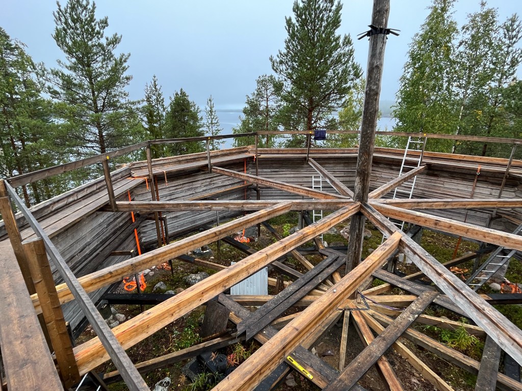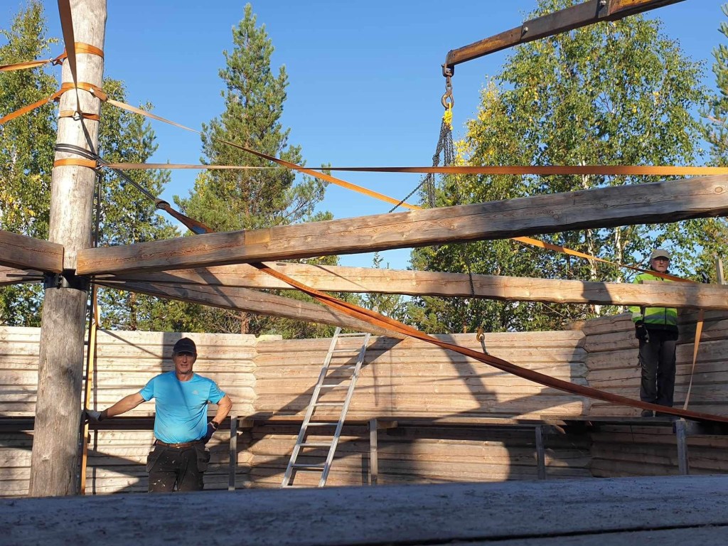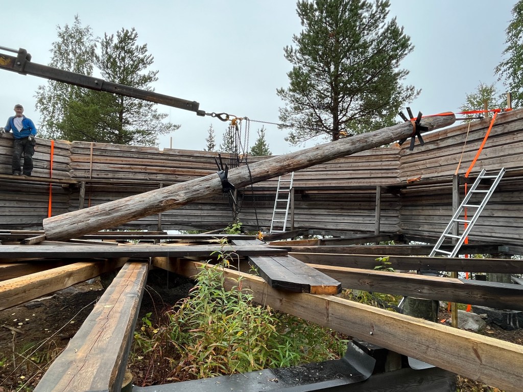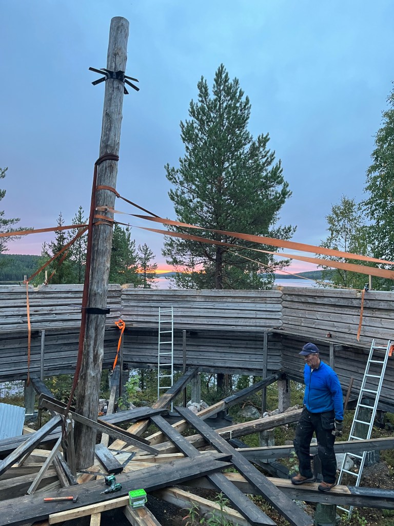 Den gångna veckan har jag och Emil fortsatt arbetet med återuppbyggnaden. Dels genom att bygga upp den tredje ställningen runt toppen av centrumstolpen dels påbörjat monteringen av de 16 takstolarna. Vädret har dock sinkat oss rejält då det har regnat kraftigt under tre dagar. Vi har satt upp 7 av de 16 och hoppas kunna göra klart stommen under tisdag och onsdag denna vecka (26-27/9) bara vädret är med oss.