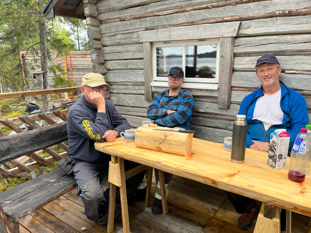 Fikapaus med Lars-Erik och Emil på bastuns altan. Timringen syns i bakgrunden till vänster.