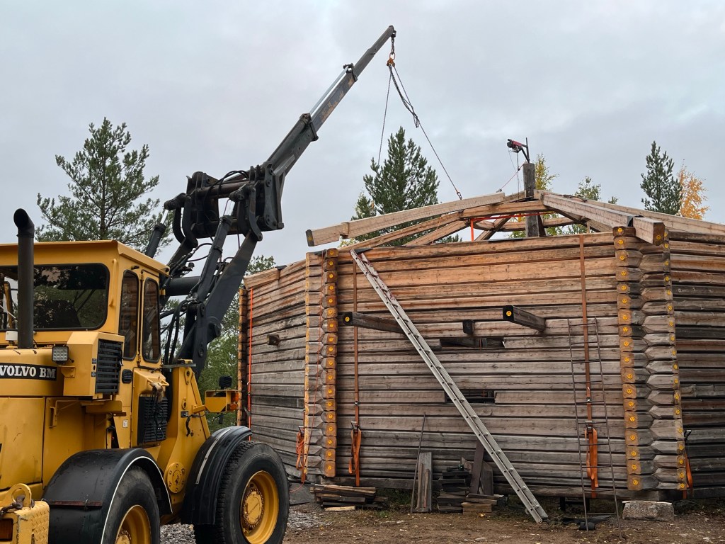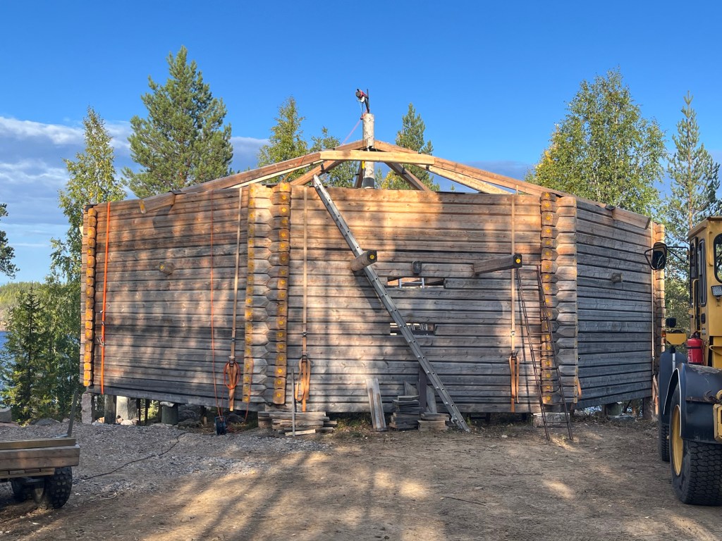 Jag själv har ägnat några dagar till att förbereda slutfasen genom att sätta upp de ”kortlingar” som ska hålla upp de takstolar som löper från de 8 knutarna. Jag har även påbörjat arbetet med att täcka syllen (golvbjälklaget) med plåtar för att skydda den mot fukt. Jag kommer behöva göra motsvarande för att skydda åsarna, knutarna i det översta väggvarvet och takstolarna.