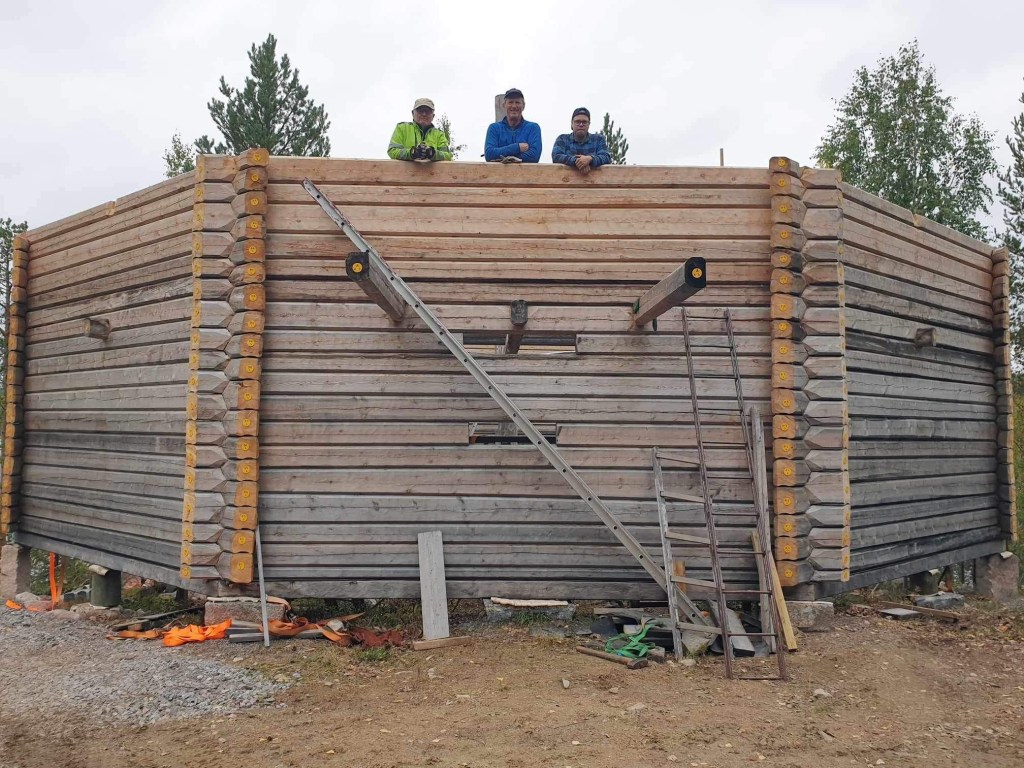 Nöjda timmermän efter monteringen av det sista väggvarvet (varv 18 med totalhöjd på ca 3,6 m).