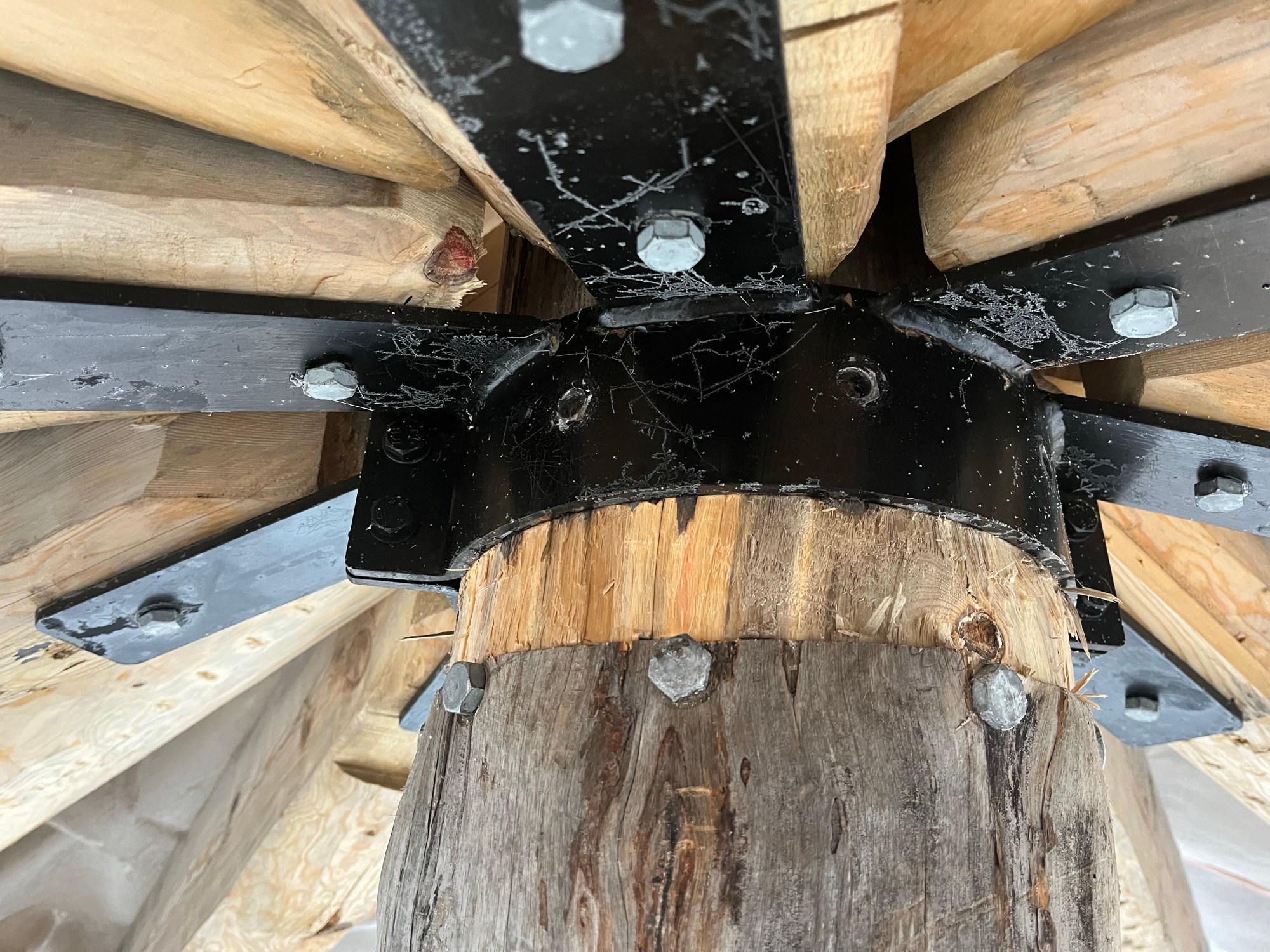 Nu blir det vintervila för projektet. Väggarna sjönk ca 5 cm under förra vintern och jag räknar med ytterligare ca 5 cm denna vinter. Jag har därför tagit höjd för detta genom att tillåta ringen runt centrumstolpen att sjunka upp till 5 cm. Se bild för närmare beskrivning.