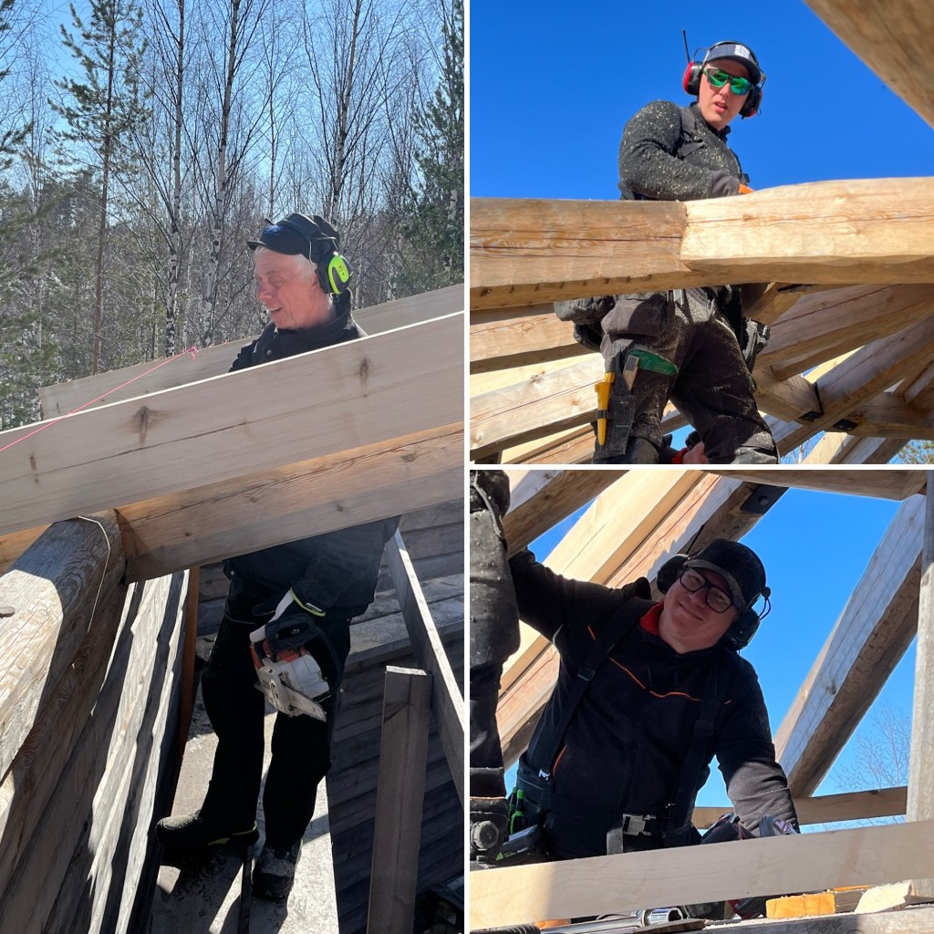 Här har Kjell (till vänster), Anton (övre bild höger) och Marcus (nedre bild höger) börjat montera planken på de timrade takstolarna.