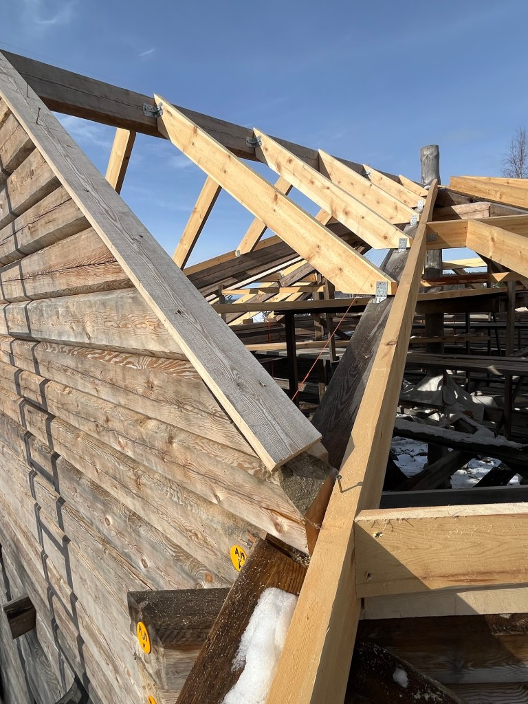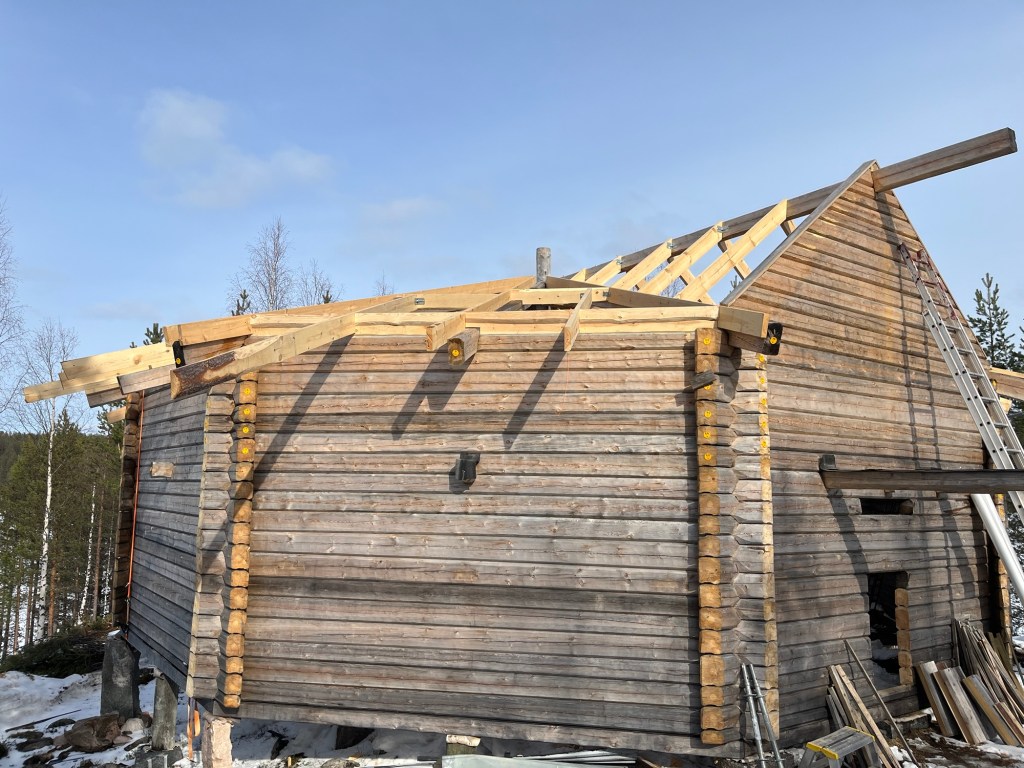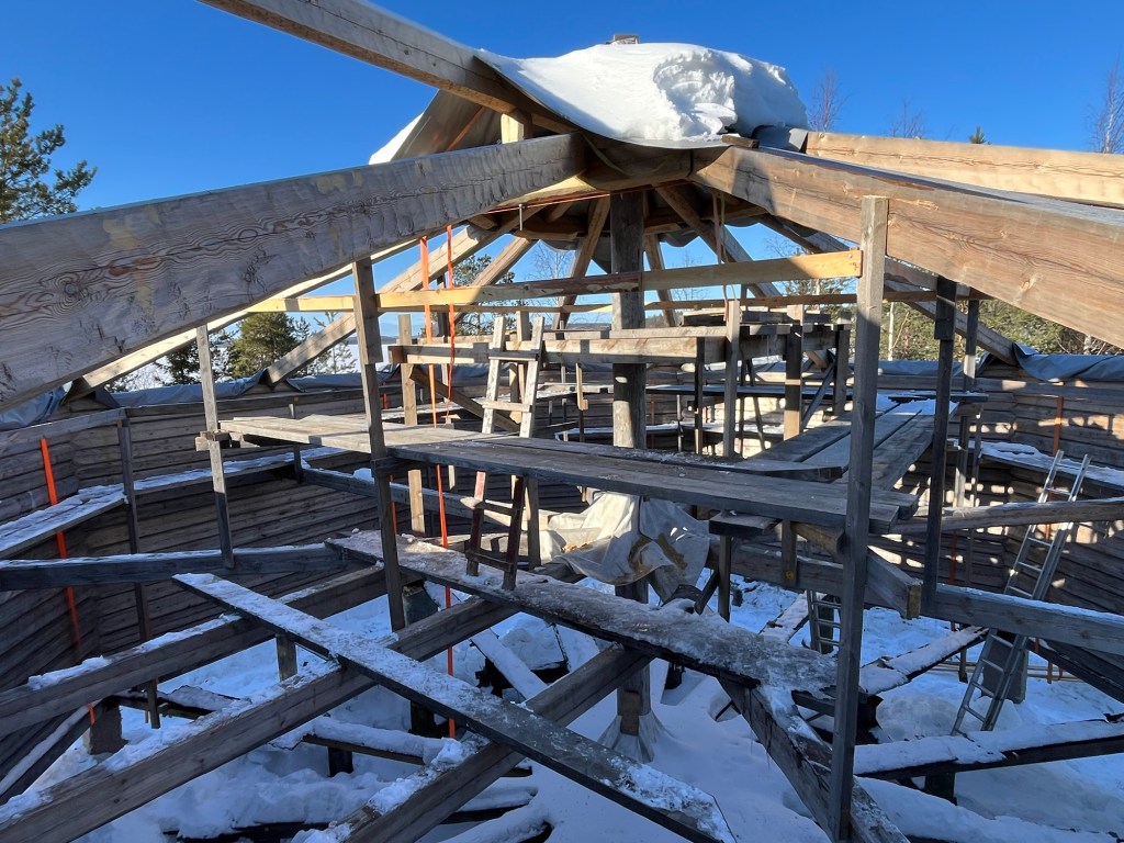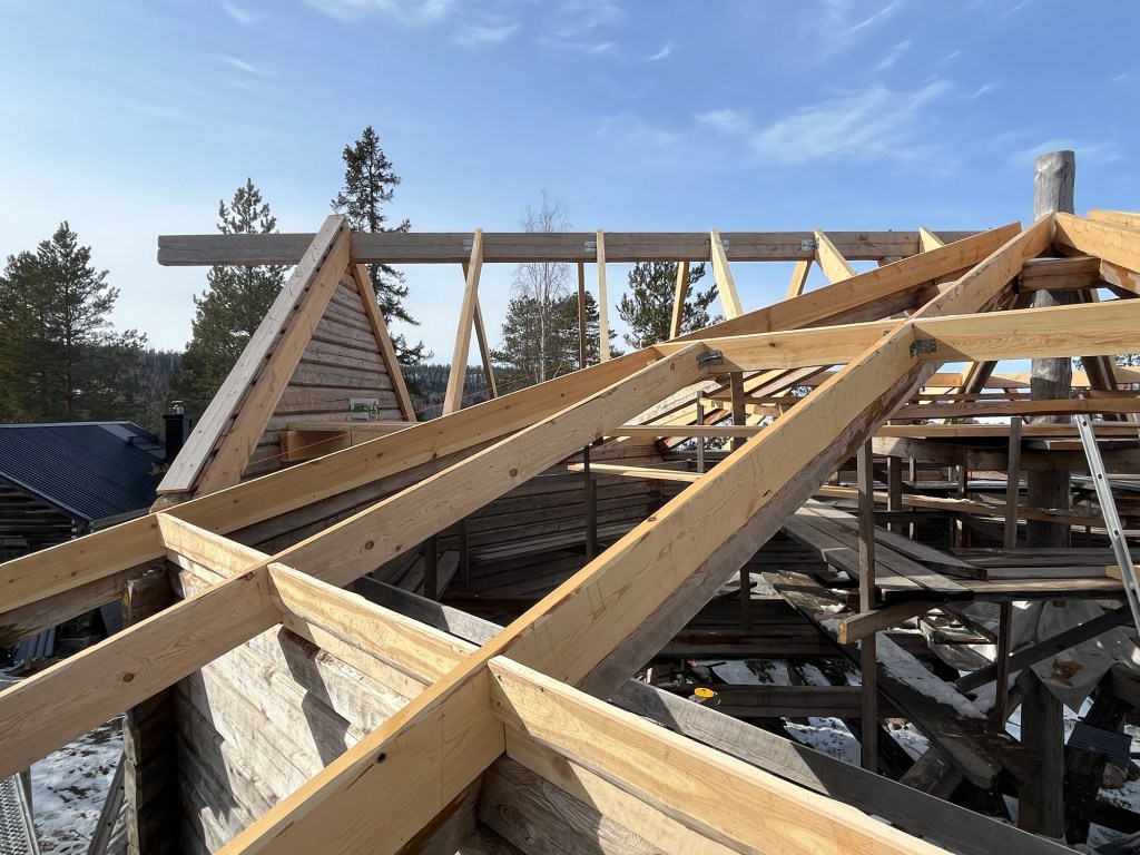 I fas 2 kommer snickarna att bygga på med råspont, och övrigt material som den bandtäckta plåten ska monteras på. Även vindskivor ska monteras runt hela timringen.