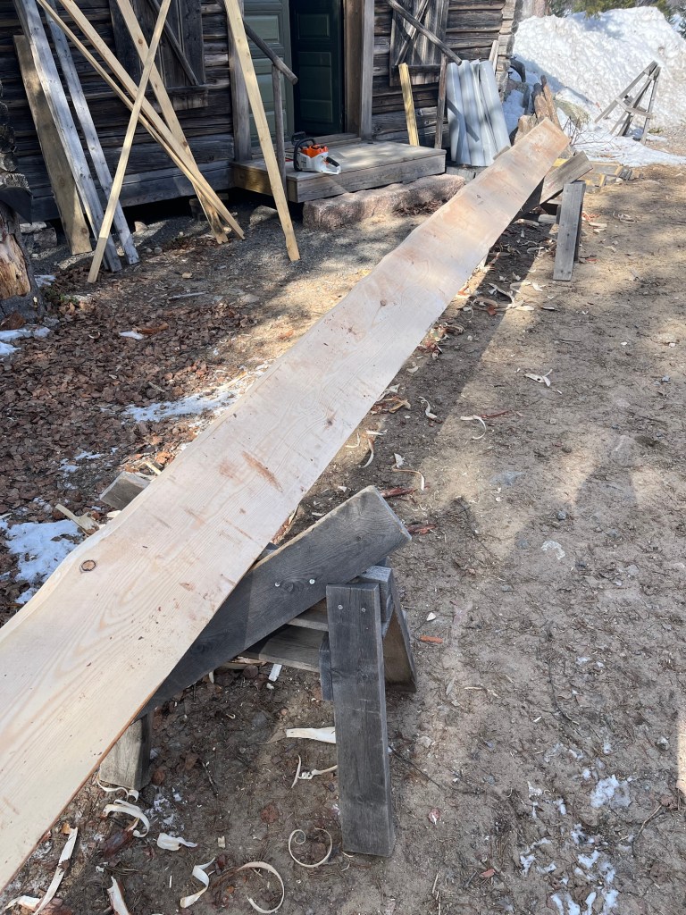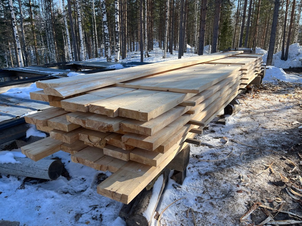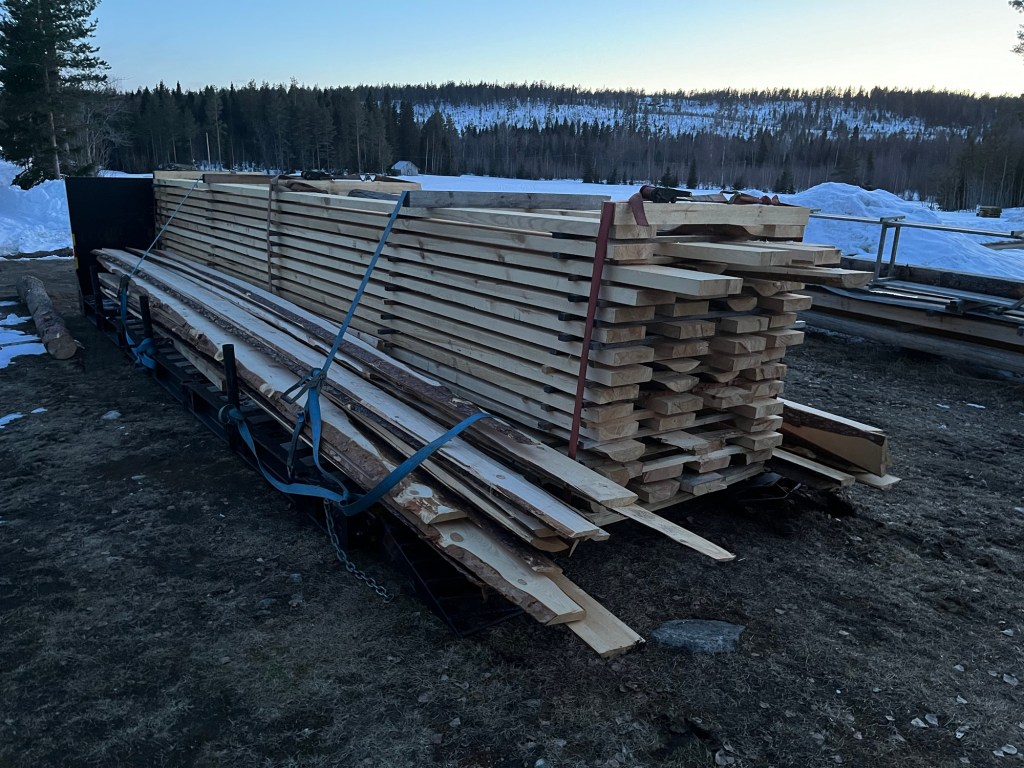 Drygt 55 st 7 m långa plank i dimensionen 50×200 mm samt vildmarkspanel till vindskivor sågade och levererade av Robert Isaksson.