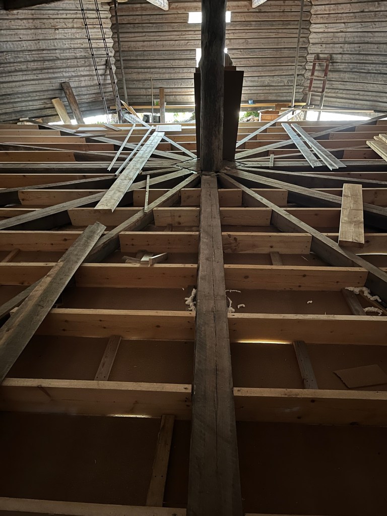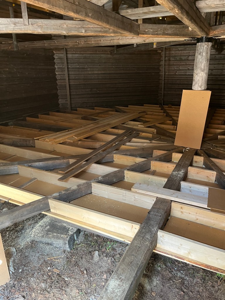 Jag rÀknar med att göra klart golvbjÀlklaget i slutet av augusti för att kunna bestÀlla isolering. Isoleringen kommer att vara lösull (riven cellulosa) som sprutas in i de byggda facken som syns pÄ bilderna.