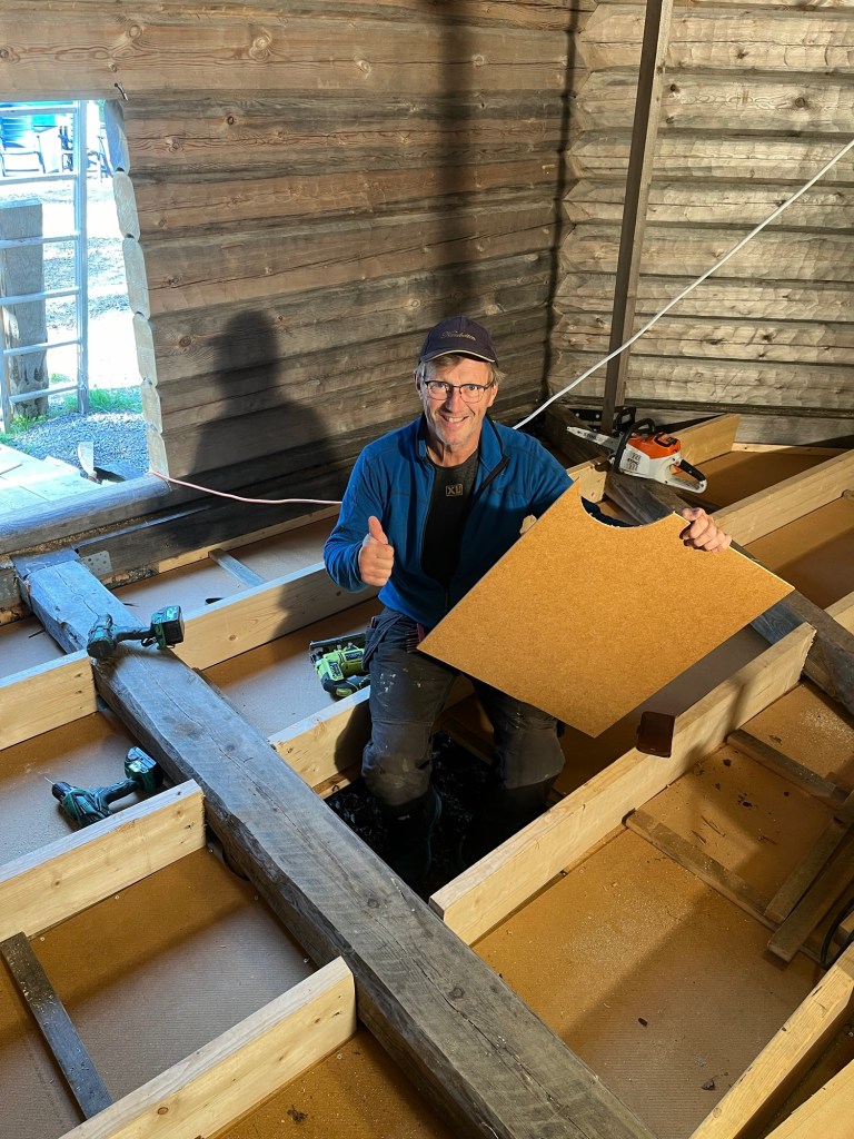 Nu är vi klara med allt underarbete för att kunna börja lägga det kilsågade furugolvet. Men det har varit ett betydligt större jobb än jag förväntade mig. En stor anledning till detta är att vi bygger ett åttakantigt hus & golv med en mängd olika vinklar och hörn…. En annan är att golvytan är över 100 kvm. Jag har fått mycket fin hjälp av Emil Lindgren i detta arbete.
