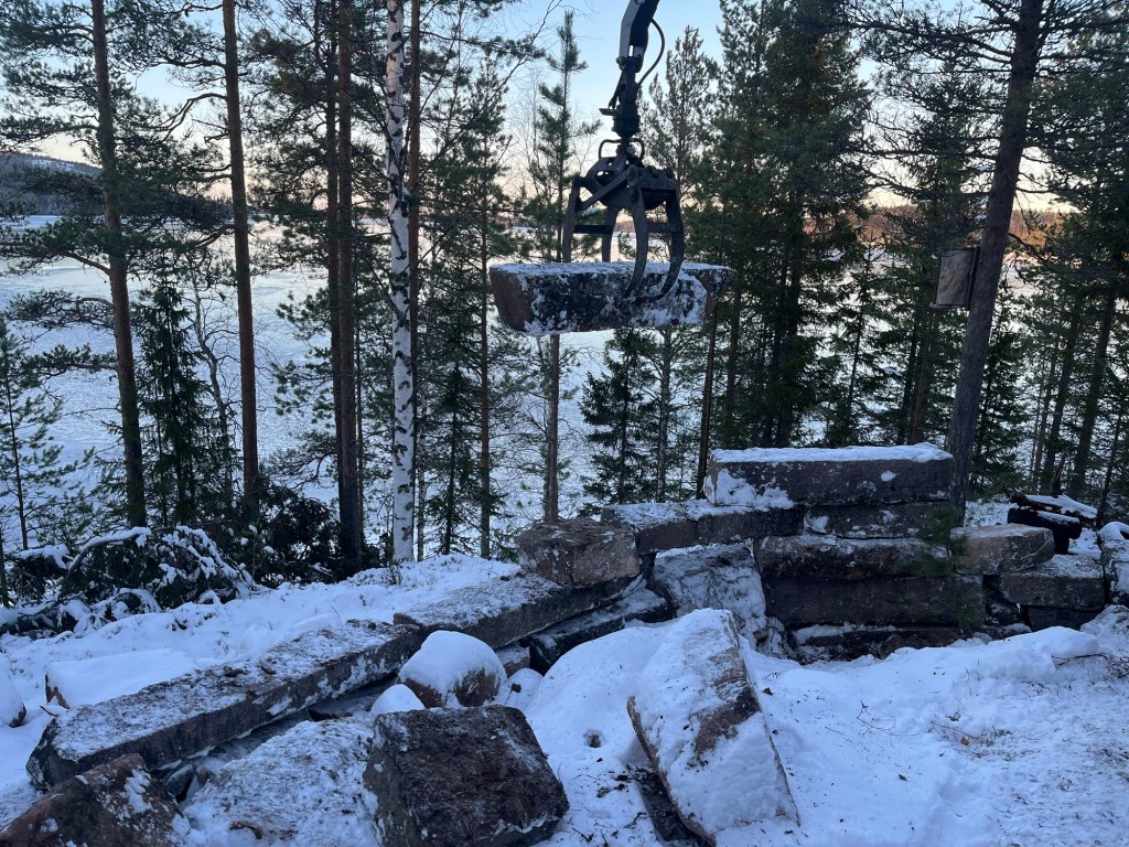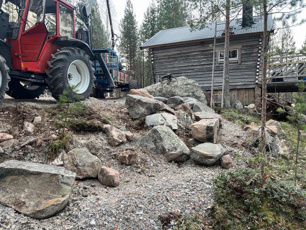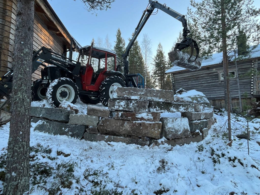Jag har samlat på mig en del huggen sten för att bl.a. göra en stödmur mot norr. Detta för att skapa ett lite större utrymme för en grillplats med utsikt mot norr där solen går ner under sommartid. De flesta huggna stenarna har jag fått tag på genom min vän Åke Hellström i Bjumisträsk.