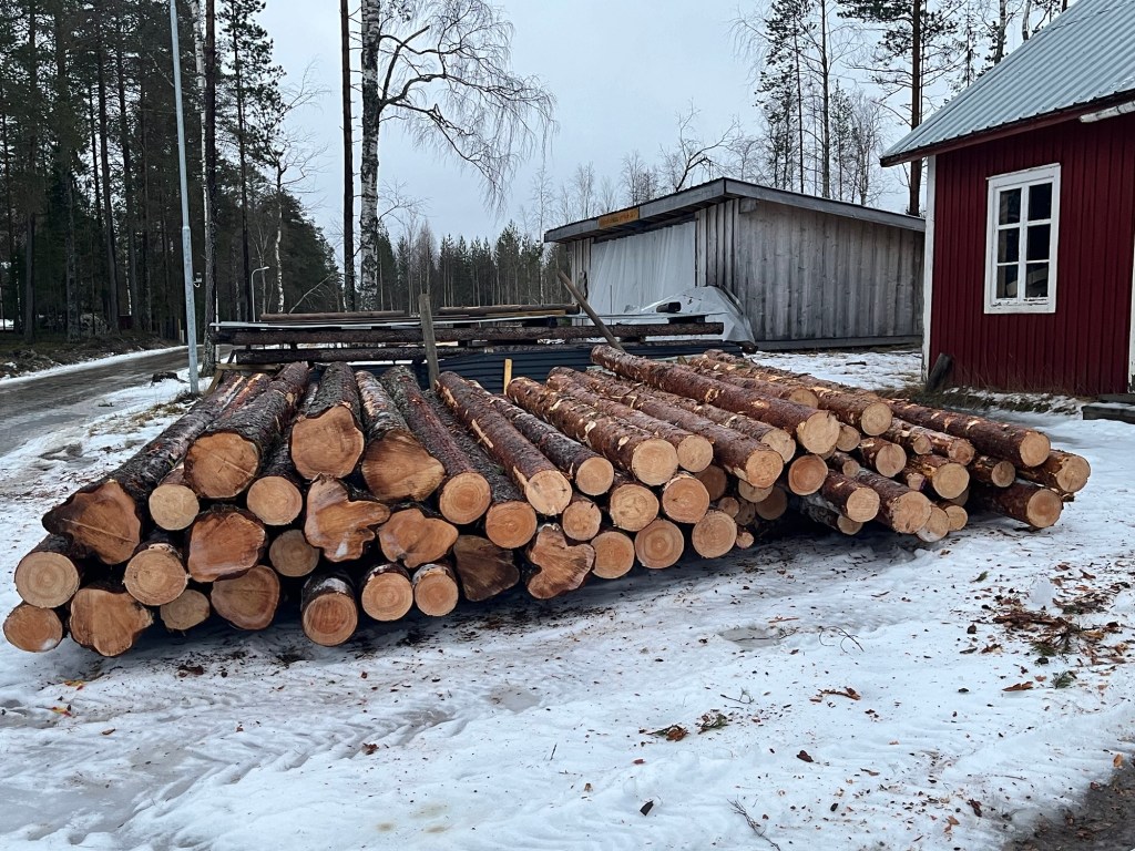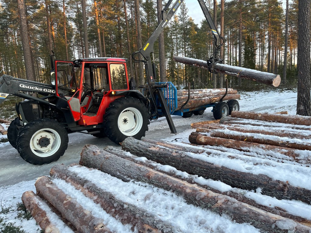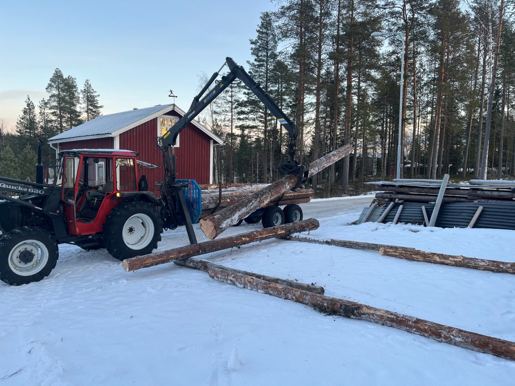 Jag har hämtat hem timmer av högsta kvalitet från skogen vid Stora Lappträsk. Det ligger ca 10 km från Västanfors så det är en liten bit att köra med traktor och vagn. Jag köpte timret av Thomas Johansson och det blev totalt fyra lass att hämta.