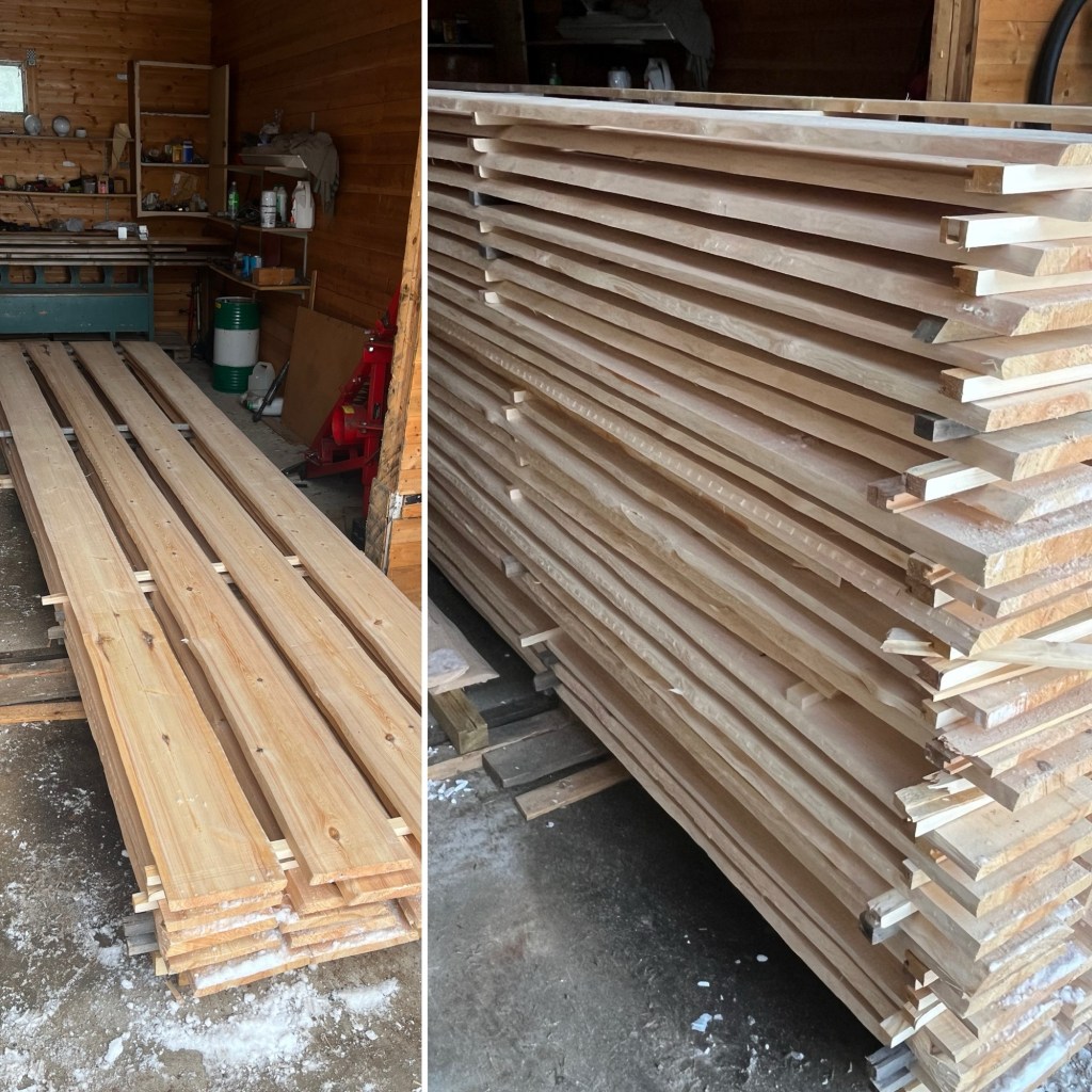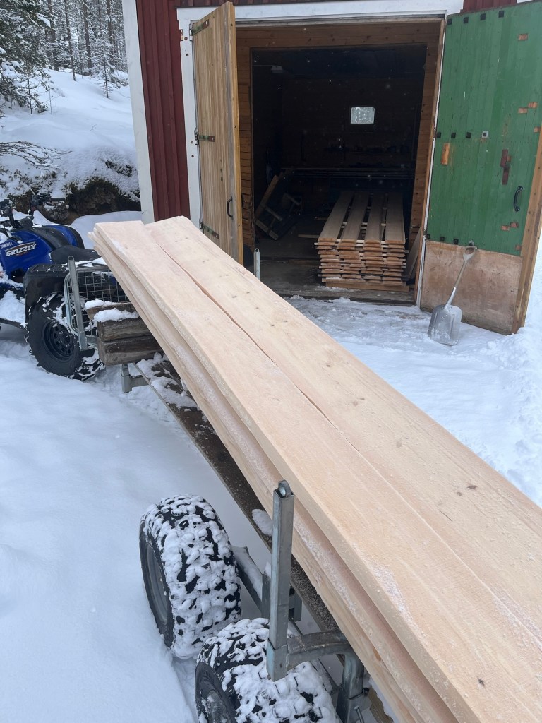 Under den första veckan sågade jag totalt 110 brädor ur 17 rotstockar. Av dessa är ca 70% 24-30 cm breda och övriga något smalare. Jag tar nu en paus och kommer att fortsätta såga i månadsskiftet mars/april.