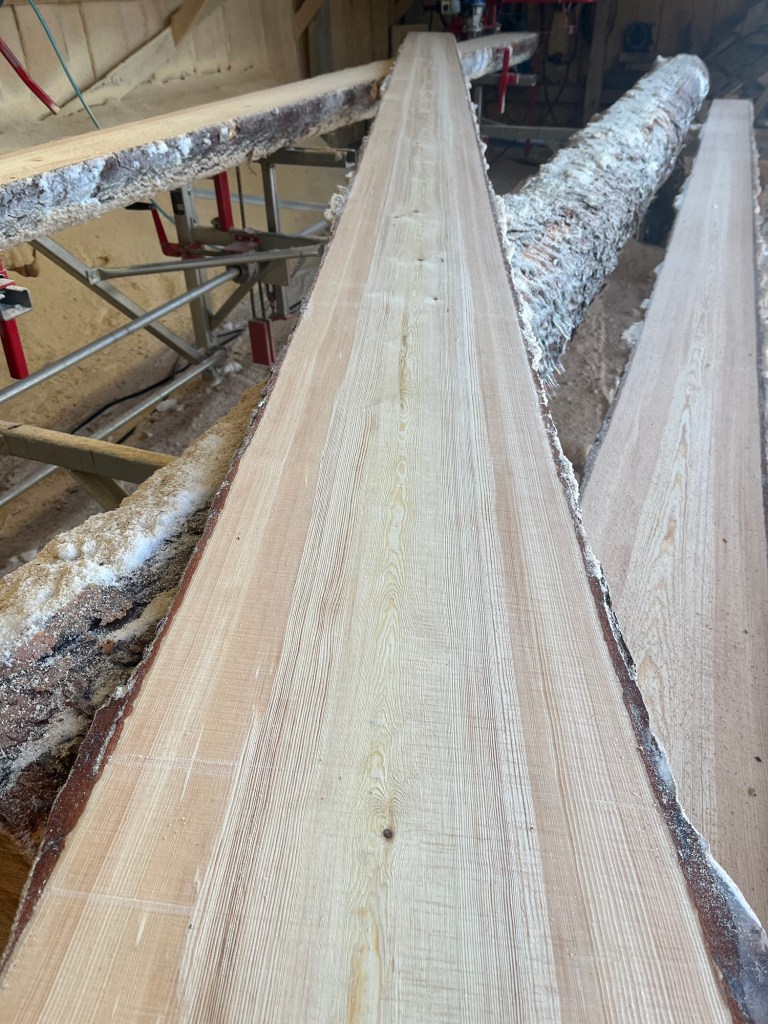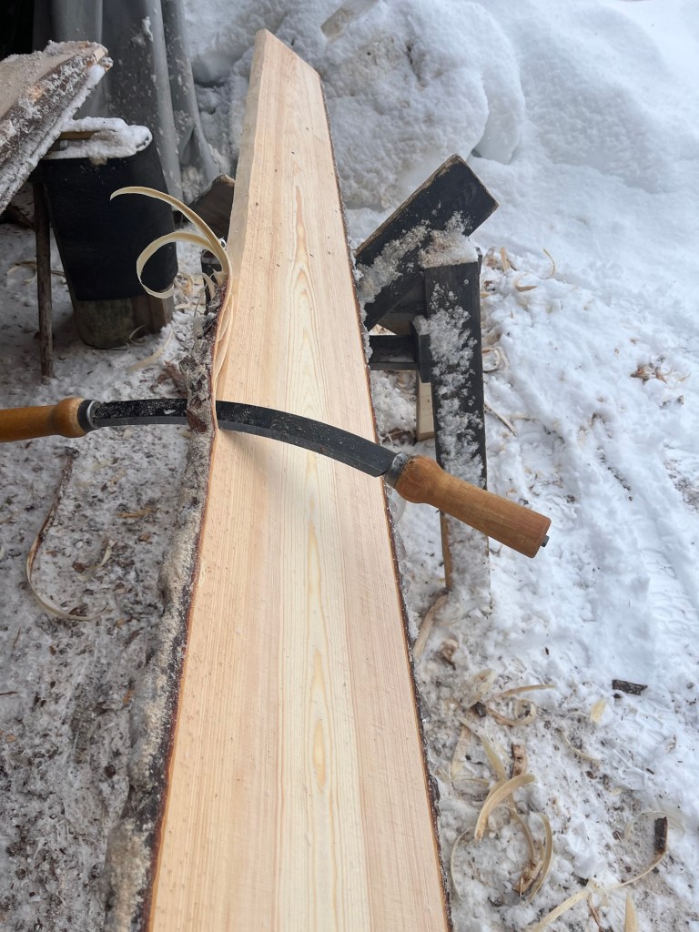 Ett tidskrävande moment är att ta bort barkkanten på varje bräda. Det gör jag med bandkniven (se bild) och man behöver vara noggrann för annars uppkommer det en brun missfärgning och merjobb när virket har torkat. Brädorna är 5,4 m långa och med bark på båda sidor blev det totalt 1188 m bark att ta bort….. 1,2 km…🤔