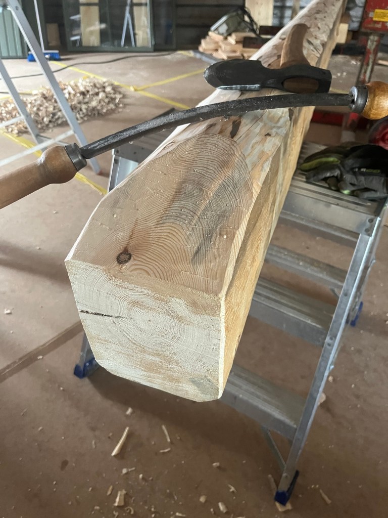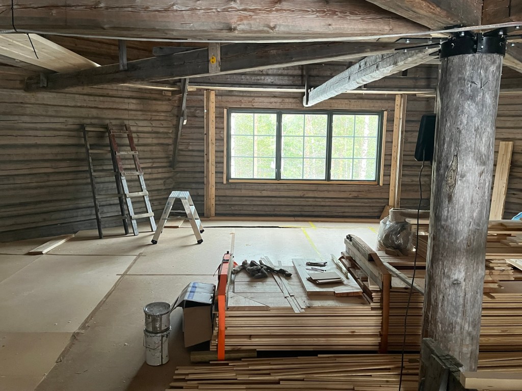 Det ska bli ett loft över halva logen, ca 50 kvm. Även loftets golv blir ett kilsågat furugolv. I början av april har jag jobbat med att förbereda läggningen av detta golv genom att komplettera de 7 åsar som är en del av stommen och som ska bära upp golvet. Dessa 7 åsar är 6,10 m långa och är i ena ändan fastsatta i ringen runt centrumstolpen och i den andra ändan går de ut genom ytterväggarna och avslutas där med en knut.