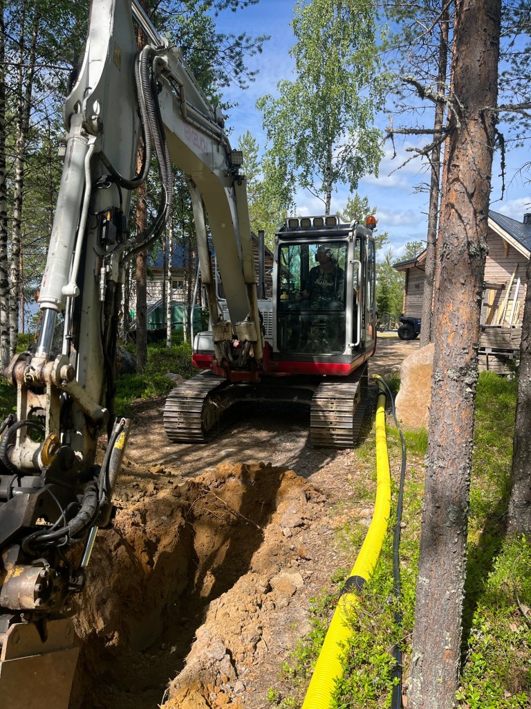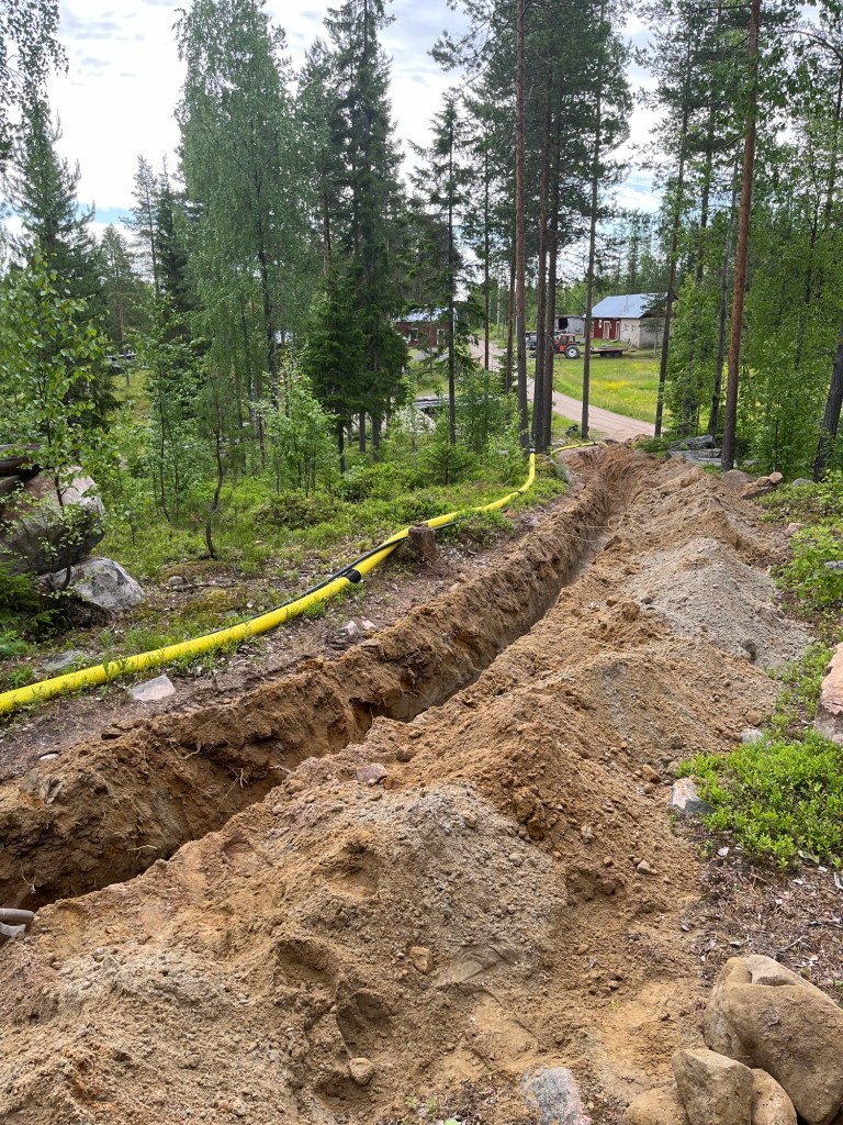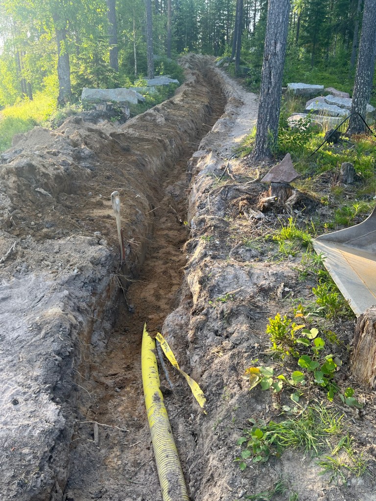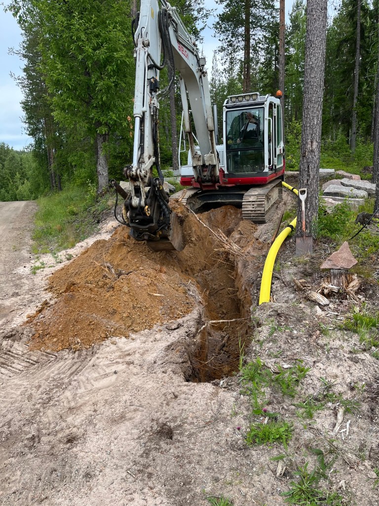 I juli och augusti låg fokus på att göra klart vägen. Den första fasen i arbetet var att gräva upp ett kabeldike och lägga ner elkabel och vattenrör från bostadshuset. Kjell Rönnbäck grävde och återfyllde vägen. Min roll var att plocka undan stenar i storleken handbollar och basketbollar. Det blev nog ett hundratal till slut…..😅