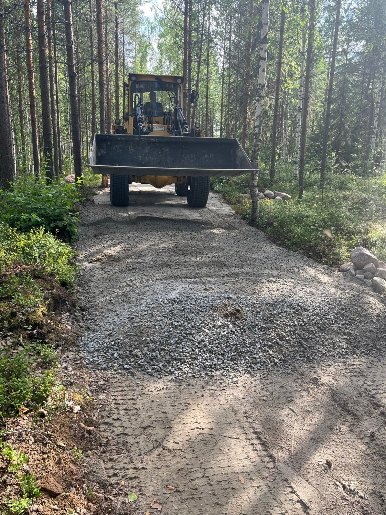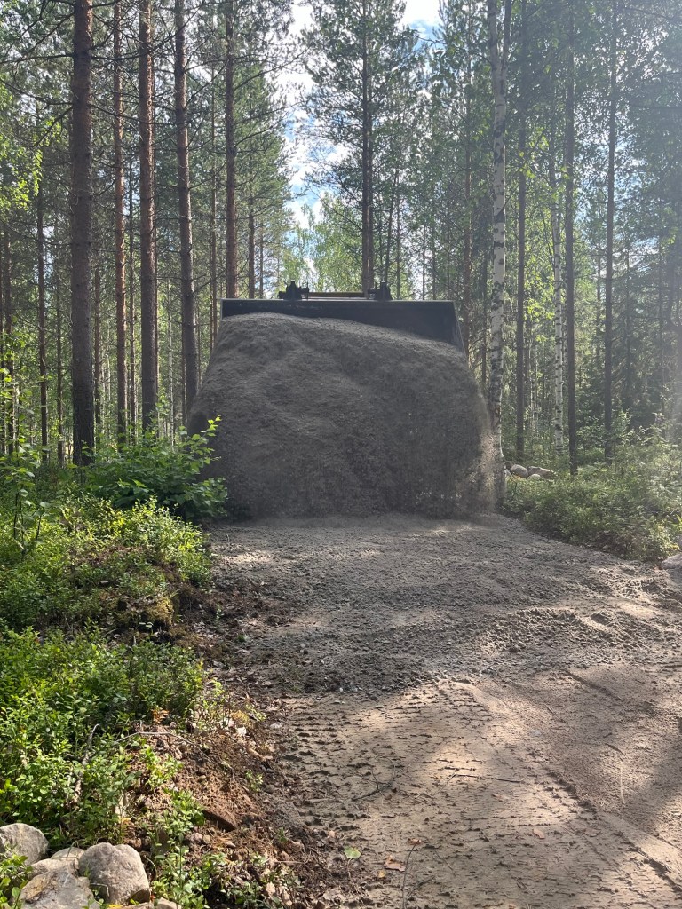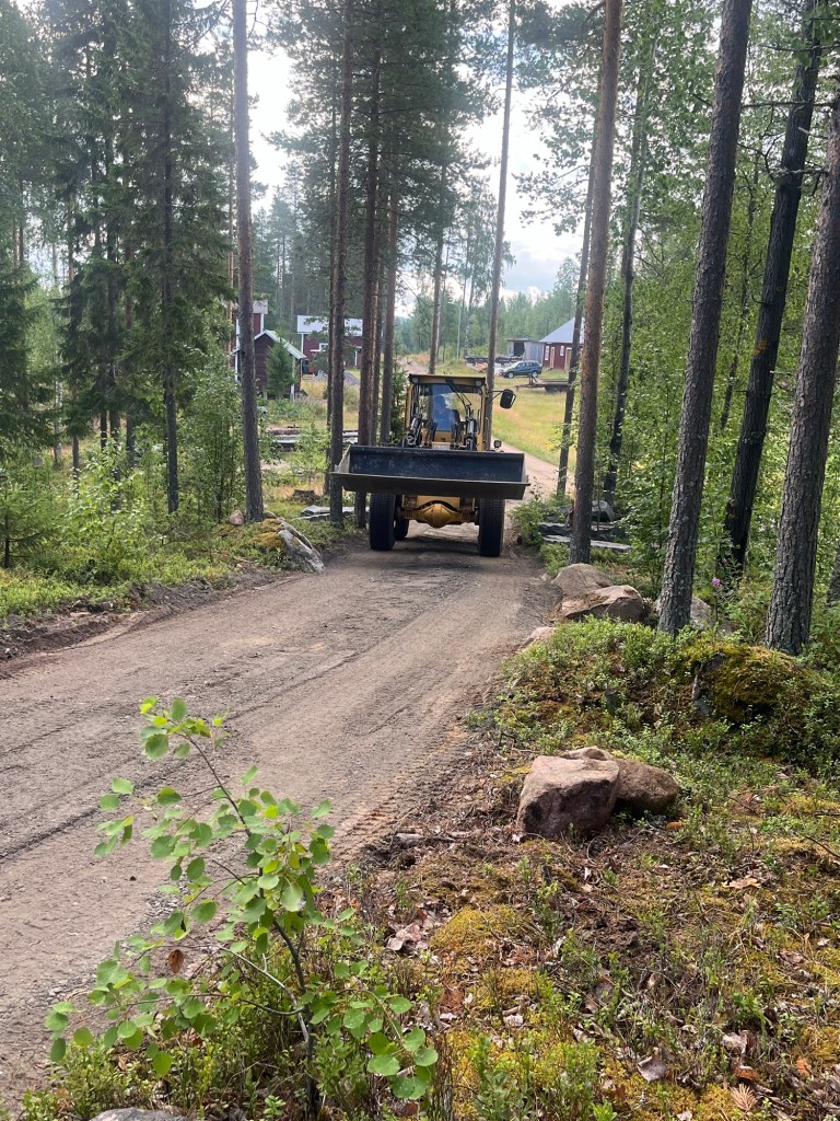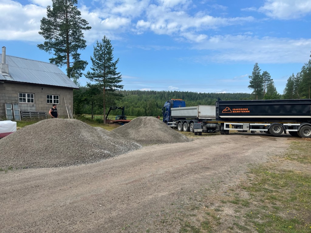Den andra fasen i vägbygget var att fylla på lite ”pinnmo” här och där för att jämna till större ojämnheter. Därefter fyllde vi på totalt närmare 100 ton grus av kvaliteten ”0-18”. Vägen är ca 170 meter lång och ca 3 meter bred och vi fyllde på och plattade till ett lager grus på ca 15 centimeter. Traktorn fick jag låna av grannen Robert Isaksson och Emil Lindgren körde maskinen på ett förtjänstfullt sätt! Min roll var återigen att plocka sten…. Men denna gång återanvände jag stenarna genom att placera dem på sidan av vägen för att hindra gruset att spridas ut för mycket.