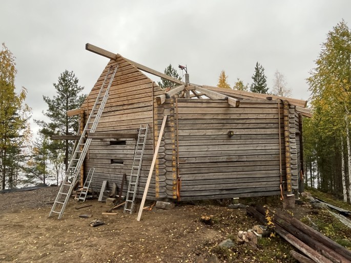 Arbetet har gått mycket bra i år! Jag färdigställde timringen på byggplatsen i juni (se bild 2) och nu 4 månader senare har vi demonterat hela stommen och de tre byggnadsställningarna, transporterat alla 200 stockar och ställningar upp till Lappvikudden. Där har vi återuppbyggt stommen och ställningarna. Vi klarade egentligen detta på 3 månader då jag har jobbat ensam den sista månaden med att fästa alla detaljer i toppen av centrumstolpen samt att skydda syll, väggbandet och toppen av centrumstolpen mot fukt. Se bild 1.