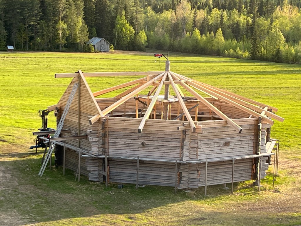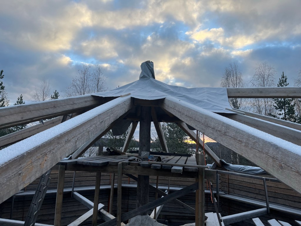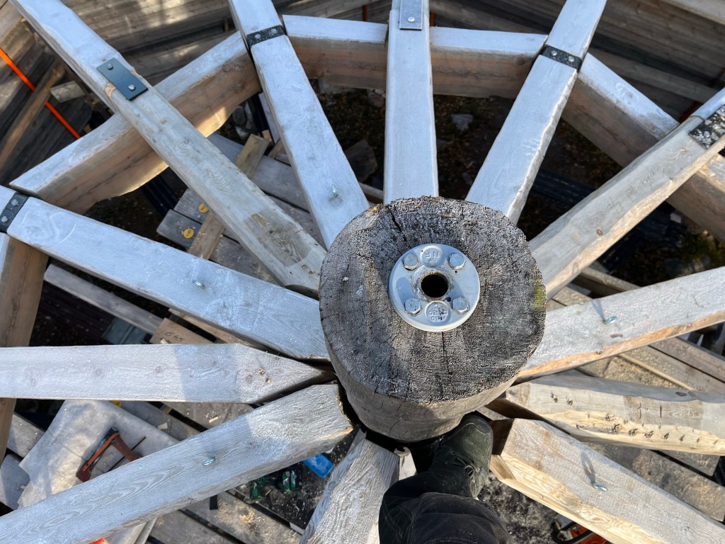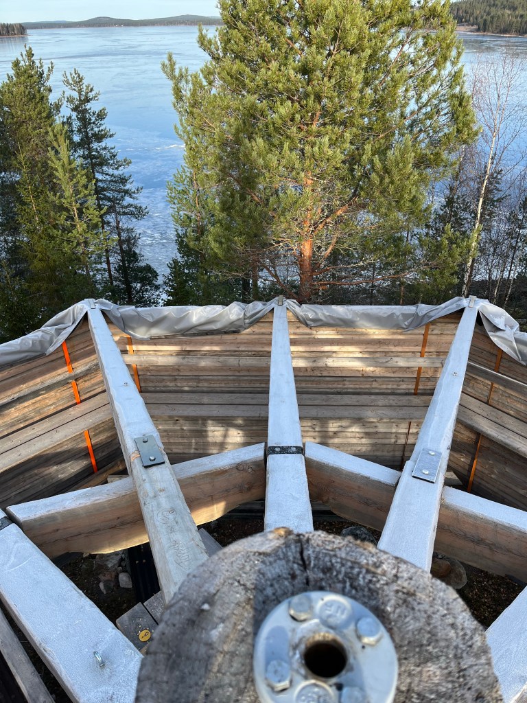 Bild 1, timmerstommen på plats på Lappvikudden 2023-10-24Bild 2, timmerstommen färdigbyggd på byggplatsen 2023-06-24Här står jag på toppen av timmerstommen….😳 Jag behövde ta mig upp hit för att lägga på den duk som ligger över toppen på stommen.En utsiktsbild från toppen av timmerstommen….Här ligger duken som skyddar toppen på plats👍Bild på duken från ett annat håll.Här har jag huggit och jämnat till centrumstolpen 5 cm under den metallring som håller takstolarna uppe. Detta för att tillåta den att sjunka i takt med ytterväggarna. Notera också att bultarna som håller ringen uppe är borttagna……😳 Men det är ingen fara då de 16 takstolarna trycker mot varandra…. Det ska bli intressant att se hur mycket lägre ringen sitter till våren!