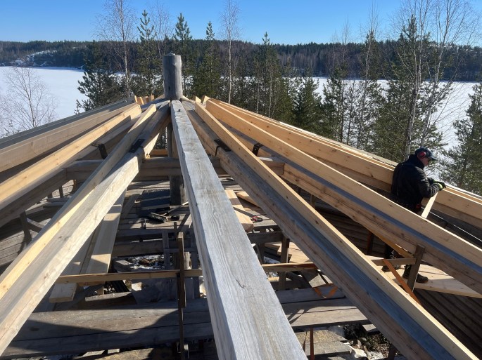 I fas 2 kommer snickarna att bygga på med råspont, och övrigt material som den bandtäckta plåten ska monteras på. Även vindskivor ska monteras runt hela timringen.