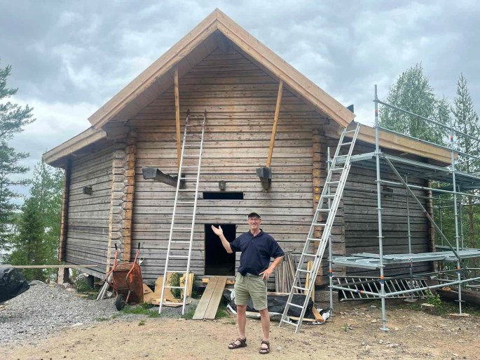 Kort video från golvnivån.Fas 1 snart klar….✅En annan vinkelMedan snickarna byggde på taket fokuserade jag på att preparera vildmarkspanelen som ska monteras som vindskivor.Fas 1 klar ✅. Nu ska en utvändig ställning resas och därefter kan fas 2 inledas.