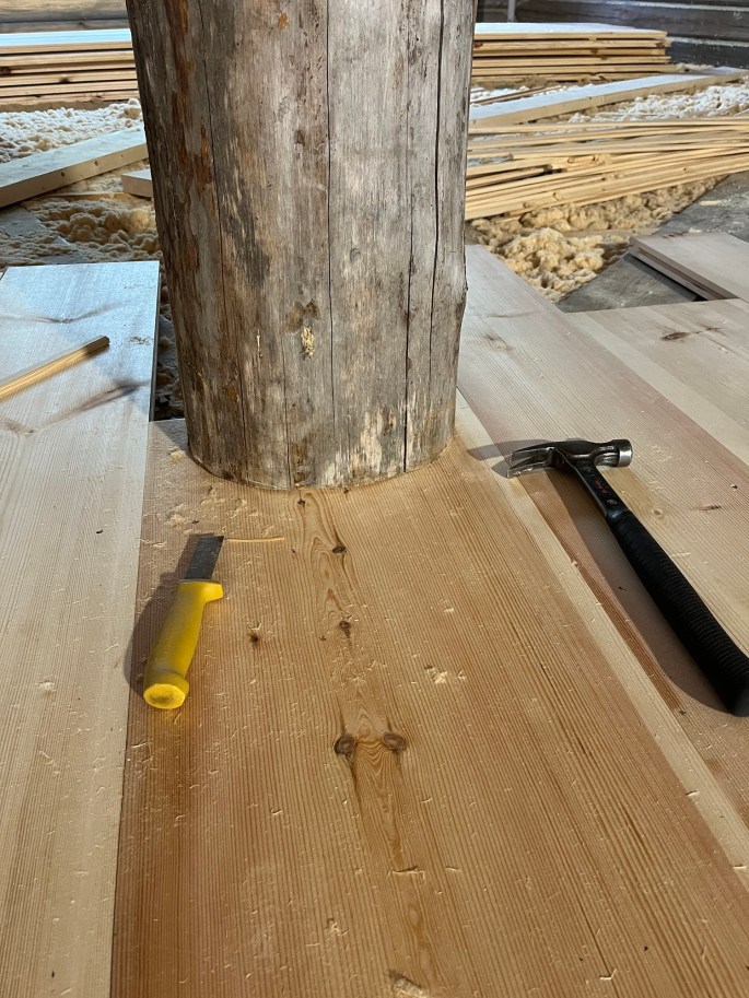 Golvplankorna levererades från Åttersta såg på försommaren och jag fick förvara dem i Knut Enströms stora garage i grannbyn Bondersbyn. Vi spände ihop dem med kraftiga spännband för att undvika att de ska vrida sig under torkprocessen.I början av september var det dags att börja hämta de långa golvplankorna. Det blev totalt fyra lass med en lånad extra lång släpvagn. Det blev mycket bärande för mig och Emil Lindgren…..Jag öppnade upp ena väggen lite grann för att få in ljus under arbetet med golvet. Tre väggstockar sågades bort. I fotot kan man se bredden på det kommande fönsterpartiet. Höjden är här drygt 60 cm men ska bli 140 cm när fönstrena monteras.Jag tillverkade en mall för att kunna såga golvplanken efter stolpens form.Här sågar Emil Rönnbäck bort en bit i botten av centrumstolpen så att golvplanken kan föras in en bit i stolpen.Första plankan på plats!👍Snygg inpassning!👍Här har vi kommit en bit på vägen….Och här har vi kommit lite mer än halvvägs då vi börjat på den andra sidan av centrumstolpen.Och här är hela golvet monterat. Hela golvet är täckt och skyddat med masonitskivor. Till våren ska golvplankorna på loftet och ett innertak monteras så golvet behöver skyddas mot ev. nedfallande saker.