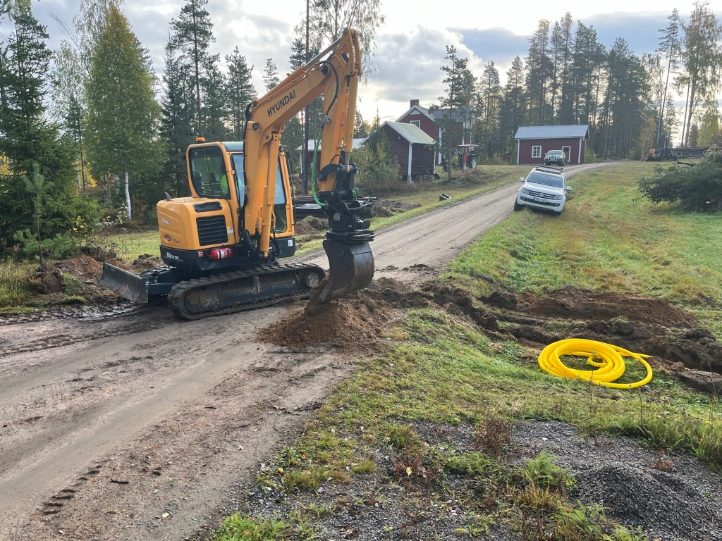 Här gräver Oskar en kabelgrav för el och vatten.Vägen grävs av en kort stund för att lägga ett rör över till den andra sidan där solpanelerna ska monteras.I åkerkanten bakom grävmaskinen och grushögen ska de markbaserade solpanelerna monteras.Här är stativet uppsatt och solpanelerna monteras.Klart ✅! 18 paneler monterade av Oliver, Peter och Patrik på Electrolegio. Jag kommer att komplettera med ytterligare 18 paneler framåt våren 2025.