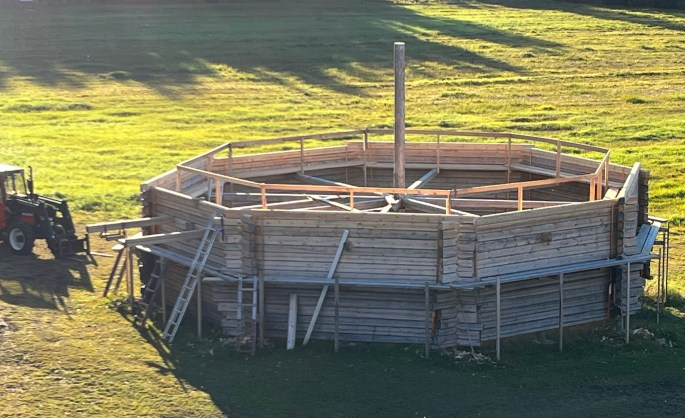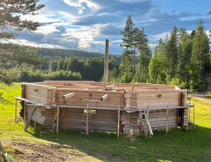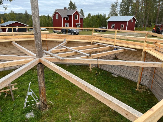Under nästa år är ett mål att kunna genomföra en taklagsfest. Det som återstår före det blir fest är ett antal i sig stora delprojekt…. 1) Timra klart och montera takstolarna (14 st); 2) märka upp och montera ner hela timringen….. (178 väggstockar, åsar och takstolar); 3) flytta dessa i rätt ordning ut till Lappvikudden; 4) montera upp timringen…..; 5) bygga ställning för att möjliggöra bygget av tak; 6) bygga taket. Men blir det inte taklagsfest nästa år så får det bli året därpå😃🥂🎂🍾.