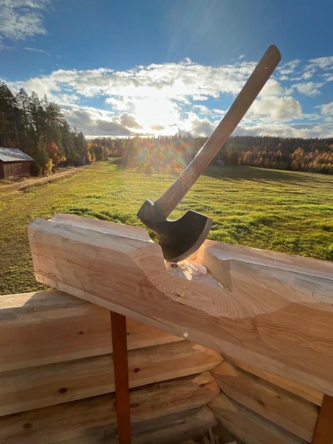 Igår den 25/10 timrade jag fast väggstock nr 139 och 140! Väggvarv nr 17,5 är därmed på plats👍. Detta innebär att jag totalt har sågat och huggit ut 560 knutar samt tillverkat, borrat hål för och hamrat i 280 dymlingar för att få väggarna att hålla ihop! I varje väggstock är det fyra knutar och två dymlingar men inte en enda spik eller skruv….. 👍💪😃