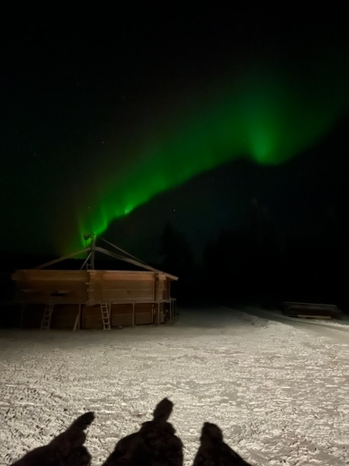 Norrskenet ser ut att stiga upp ur timringen!🙏♥️Det magiska norrskenet!Bastun ute på Lappvikudden👍Välkommen in i värmen🙏Varmt och gott trots -14 utanför👌😅FörrummetElin och Frida på besök för bastubad👍♥️
