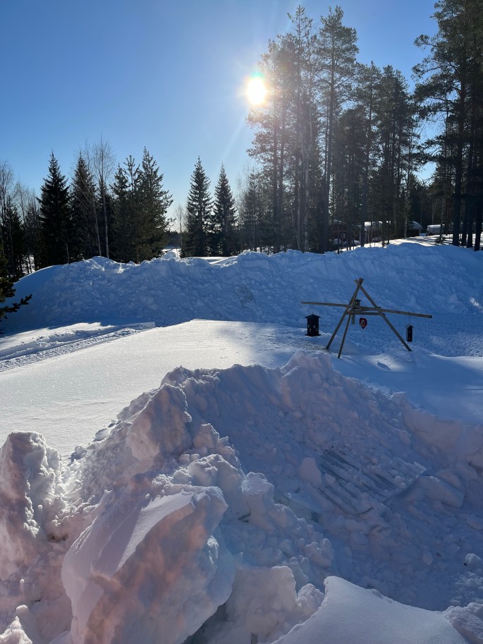 En vacker solstorm på himlen över gården hälsade mig välkommen! Det är en magisk upplevelse att få uppleva detta fenomen. Varje gång🙏♥️Den andra kvällen var det ”bara” vackert väder….Kallt på morgonen….🥶Rejält med snö och mycket arbete med att skotta bort den för att komma åt de stockar jag behöver….Såghuset framskottat och klart att öppnas upp…👍Kallt och vackert!♥️ Enorma snöhögar från skottningen av gårdsplanen.Bild inifrån timringenDet ligger mycket snö på åsarna. Jag kommer att skotta bort den för att undvika onödig fukt i timringen när snösmältningen sätter igång.Då var takstol nr 1 av 14 klar ✅ 7,5 meter lång i dimensionen 6 x 8,5-10 tum (14,5 cm bred och 21,5-25,5 cm hög).