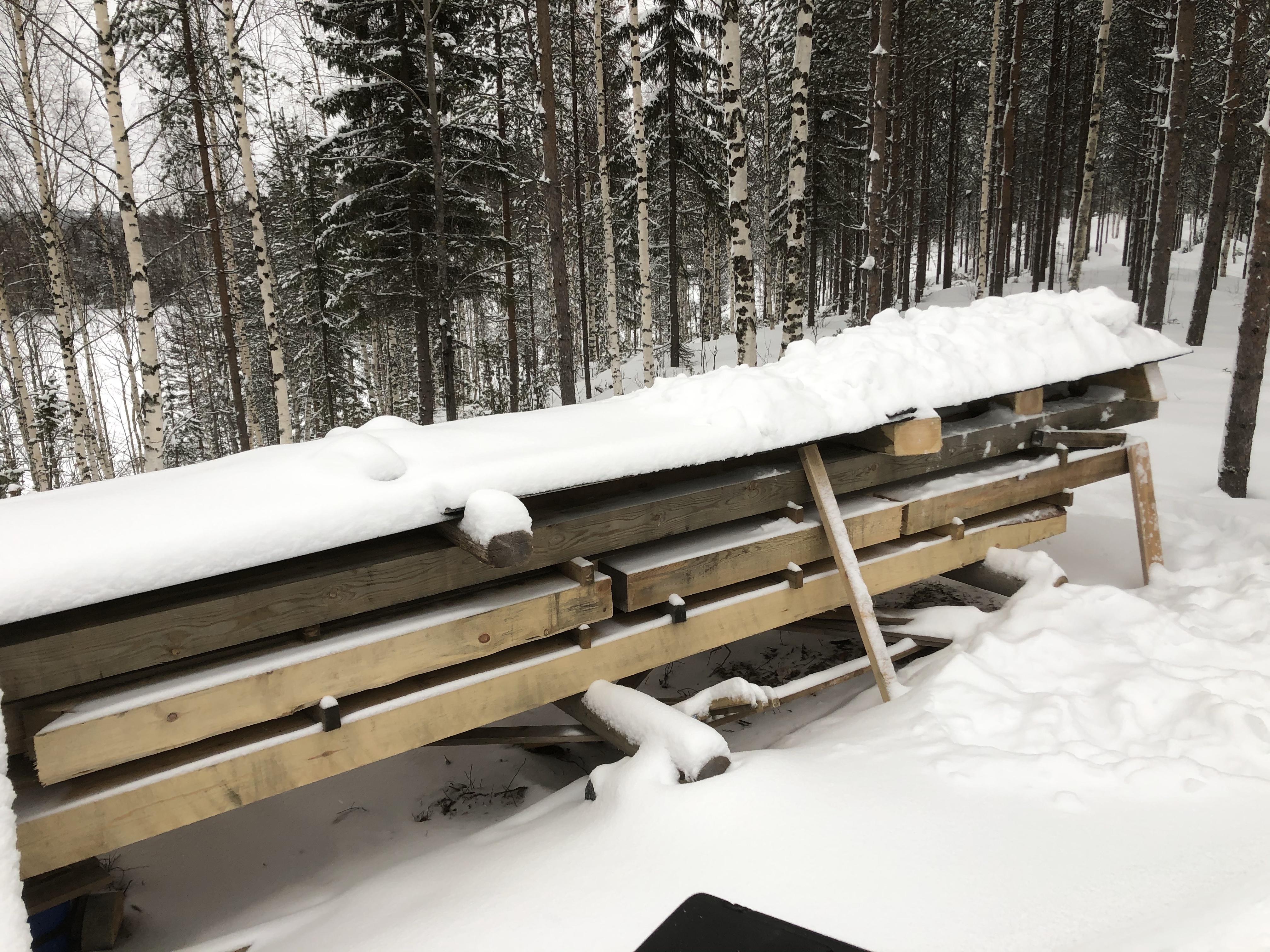 Ladan med påbörjad uppmärkning av stockarna.Samtliga ändar på stockarna får en egen lapp. Det blir totalt 120 lappar då det är 15 stockvarv. Till detta kommer gavelspetsarna med totalt ytterligare ca 30 lappar….😅